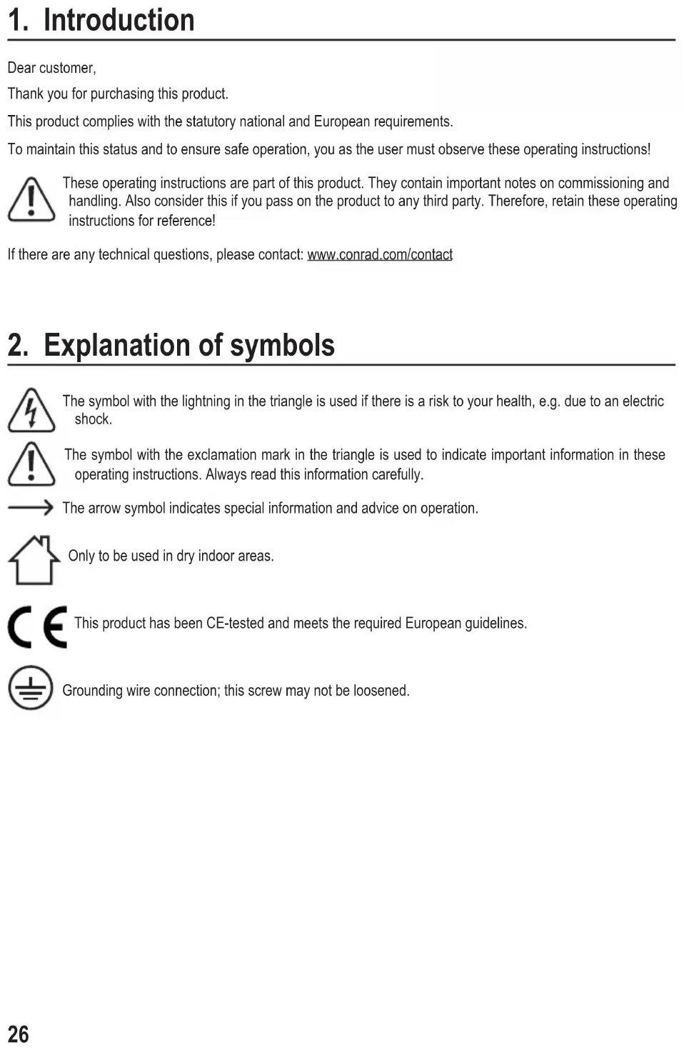Dear customer, Thank you for purchasing this product. This product complies with the statutory national and European requirements. To maintain this status and to ensure safe operation, you as the user must observe these operating instructions! These operating instructions are part of this product. They contain important notes on commissioning and handling. Also consider this if you pass on the product to any third party. Therefore, retain these operating instructions for reference! If there are any technical questions, please contact: www.conrad.com/contact