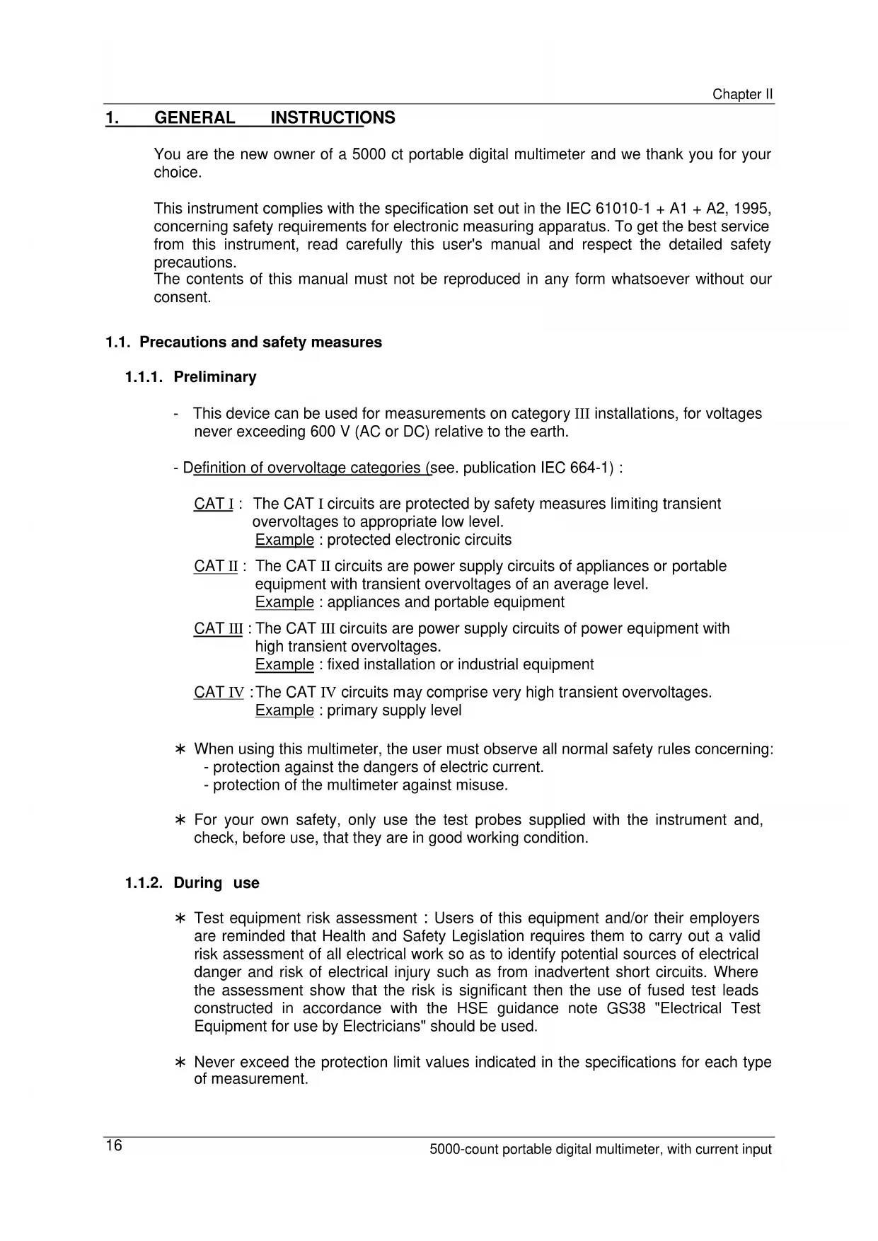 You are the new owner of a 5000 ct portable digital multimeter and we thank you for your choice. This instrument complies with the specification set out in the IEC 61010-1 + A1 + A2, 1995, concerning safety requirements for electronic measuring apparatus. To get the best service from this instrument, read carefully this user's manual and respect the detailed safety precautions. The contents of this manual must not be reproduced in any form whatsoever without our consent. 1.1. Precautions and safety measures