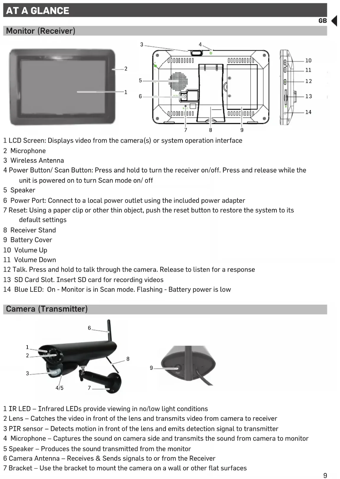 Monitor (Receiver) 1 LCD Screen: Displays video from the camera(s) or system operation interface 2 Microphone 3 Wireless Antenna 4 Power Button/ Scan Button: Press and hold to turn the receiver on/off. Press and release while the unit is powered on to turn Scan mode on/ off 5 Speaker 6 Power Port: Connect to a local power outlet using the included power adapter 7 Reset: Using a paper clip or other thin object, push the reset button to restore the system to its default settings 8 Receiver Stand 9 Battery Cover 10 Volume Up 11 Volume Down 12 Talk. Press and hold to talk through the camera. Release to listen for a response 13 SD Card Slot. Insert SD card for recording videos 14 Blue LED: On - Monitor is in Scan mode. Flashing - Battery power is low Camera (Transmitter) 1 IR LED – Infrared LEDs provide viewing in no/low light conditions 2 Lens – Catches the video in front of the lens and transmits video from camera to receiver 3 PIR sensor – Detects motion in front of the lens and emits detection signal to transmitter 4 Microphone – Captures the sound on camera side and transmits the sound from camera to monitor 5 Speaker – Produces the sound transmitted from the monitor 6 Camera Antenna – Receives & Sends signals to or from the Receiver 7 Bracket – Use the bracket to mount the camera on a wall or other flat surfaces