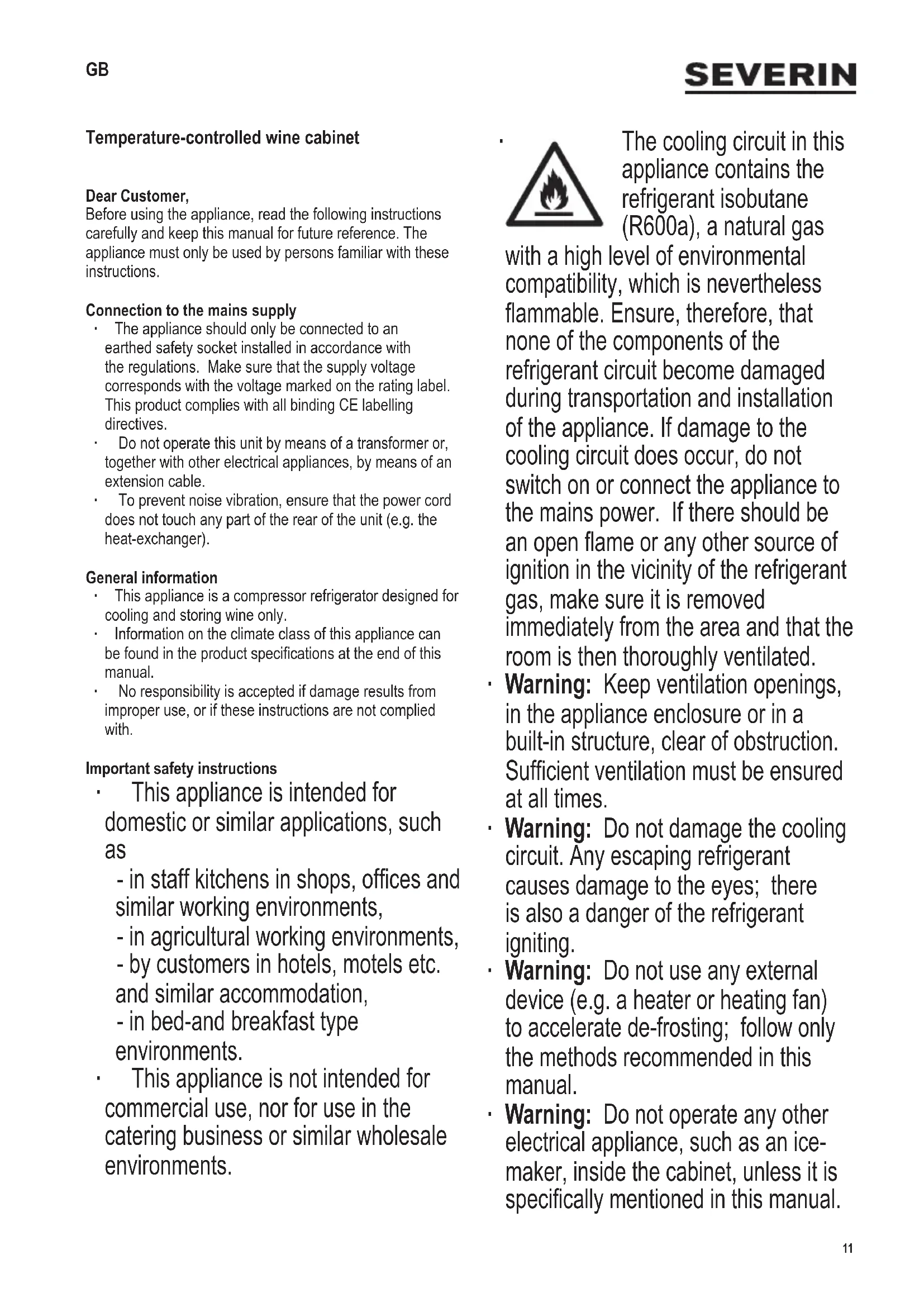 The cooling circuit in this appliance contains the refrigerant isobutane (R600a), a natural gas with a high level of environmental compatibility, which is nevertheless ammable. Ensure, therefore, that none of the components of the refrigerant circuit become damaged during transportation and installation of the appliance. If damage to the cooling circuit does occur, do not switch on or connect the appliance to the mains power. If there should be an open ame or any other source of ignition in the vicinity of the refrigerant gas, make sure it is removed immediately from the area and that the room is then thoroughly ventilated. ∙ Warning: Keep ventilation openings, in the appliance enclosure or in a built-in structure, clear of obstruction. Sufcient ventilation must be ensured at all times. ∙ Warning: Do not damage the cooling circuit. Any escaping refrigerant causes damage to the eyes; there is also a danger of the refrigerant igniting. ∙ Warning: Do not use any external device (e.g. a heater or heating fan) to accelerate de-frosting; follow only the methods recommended in this manual. ∙ Warning: Do not operate any other electrical appliance, such as an ice- maker, inside the cabinet, unless it is specically mentioned in this manual. GB12 142 x 208 mm ∙ Caution: Do not remove the cover of the interior LED light. If there should be any malfunction, please contact the customer service for assistance. ∙ Before the unit is connected to the mains, it must be thoroughly checked for any signs of damage incurred during transport, including damage to the power cord. In the event of any such damage being found, the unit must not be connected to the mains. ∙ When positioning the appliance, ensure the supply cord is not trapped or damaged. ∙ Do not locate portable multiple-socket outlets or portable power supplies at the rear of the appliance. ∙ This appliance is not designed for the storage of explosive substances such as aerosol cans with a ammable propellant. ∙ If the unit is sold, handed over to a third party or disposed of at a suitable recycling facility, attention must be drawn to the presence of the insulation agent ‘cyclopenthane’ as well as to the refrigerant R 600 a. For additional information on correct recycling please refer to the section Disposal. ∙ In order to comply with safety regulations and to avoid hazards, any repairs or modications to this unit must be carried out by our authorised service personnel, including the replacement of the power cord. ∙ This appliance may be used by children (at least 8 years of age) and by persons with reduced physical, sensory or mental capabilities, or lacking experience and knowledge, provided they have been given supervision or instruction concerning the use of the appliance and fully understand all dangers and safety precautions involved. ∙ Children aged from 3 to 8 years are allowed to load and unload the appliance. ∙ Children must not be permitted to play with the appliance. ∙ Children must not be permitted to carry out any cleaning or maintenance work on the appliance unless they are supervised. ∙ For frequent cleaning we recommend the use of warm water with some mild detergent. For detailed information on cleaning the appliance, please refer to the section Cleaning and care. ∙ To avoid the risk of electric shock, do not clean the appliance with liquids or immerse it. ∙ Caution: do not remove the cover of the interior LED light. If there should be any malfunction, please contact the customer service for assistance. To avoid contamination of food respect the following instructions: ∙ Opening the door for long periods can cause a signicant increase of the temperature in the compartments of the appliance. Always ensure that the door is properly closed and that the seal is not obstructed by wine bottles inside the cabinet or door. ∙ Clean regularly surfaces that can come in contact with food and accessible drainage systems.13 142 x 208 mm ∙ If the appliance is left empty for long periods, turn it off, clean it, and leave the door open to prevent mould from developing within the appliance. ∙ This appliance is designed for storing wine only. ∙ To prevent the risk of personal injury or damage to the unit, it must only be transported while in its original packaging. Two people are required for unpacking and installation. ∙ The rollers on the underside of the appliance are intended for short-distance handling only. ∙ Caution: Keep any packaging materials well away from children – these are a potential source of danger, e.g. of suffocation. ∙ The power cord should be regularly examined for any signs of damage. In the event of such damage being found, the appliance must no longer be used. ∙ To avoid the risk of re, do not place any electric appliances on top of the unit. Do not place any liquid containers on top of the unit: this will prevent any leaking or escaping liquid damaging the electrical insulation. ∙ Do not cover, modify or remove the pull-out wooden shelves. Always ensure sufcient air circulation within the appliance. ∙ Do not lean or put undue weight on the shelves, door etc. ∙ Never pull out more than one wooden shelf at a time, as this may cause the appliance to tip over. ∙ Protect the inside of the unit at all times from open ames and any other sources of ignition. ∙ Remove the plug from the wall socket - in case of any malfunction, - during cleaning, - before maintenance or repair work is carried out. ∙ When removing the plug from the wall socket, never pull on the power cord; always grip the plug itself. ∙ We reserve the right to introduce technical modications. Familiarisation