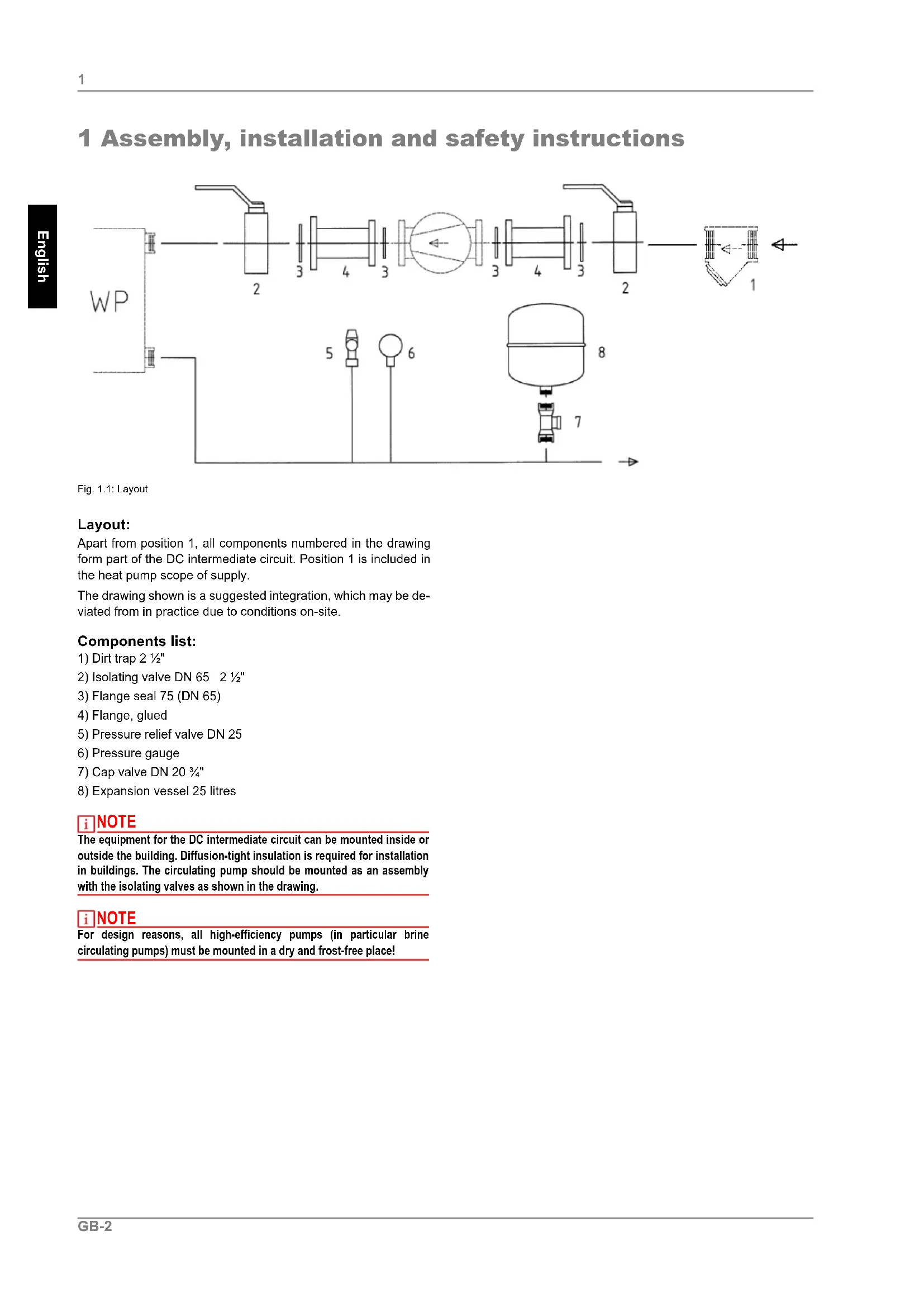 NOTE The equipment for the DC intermediate circuit can be mounted inside or outside the building. Diffusion-tight insulation is required for installation in buildings. The circulating pump should be mounted as an assembly with the isolating valves as shown in the drawing. NOTE For design reasons, all high-efficiency pumps (in particular brine circulating pumps) must be mounted in a dry and frost-free place!GB-3 English