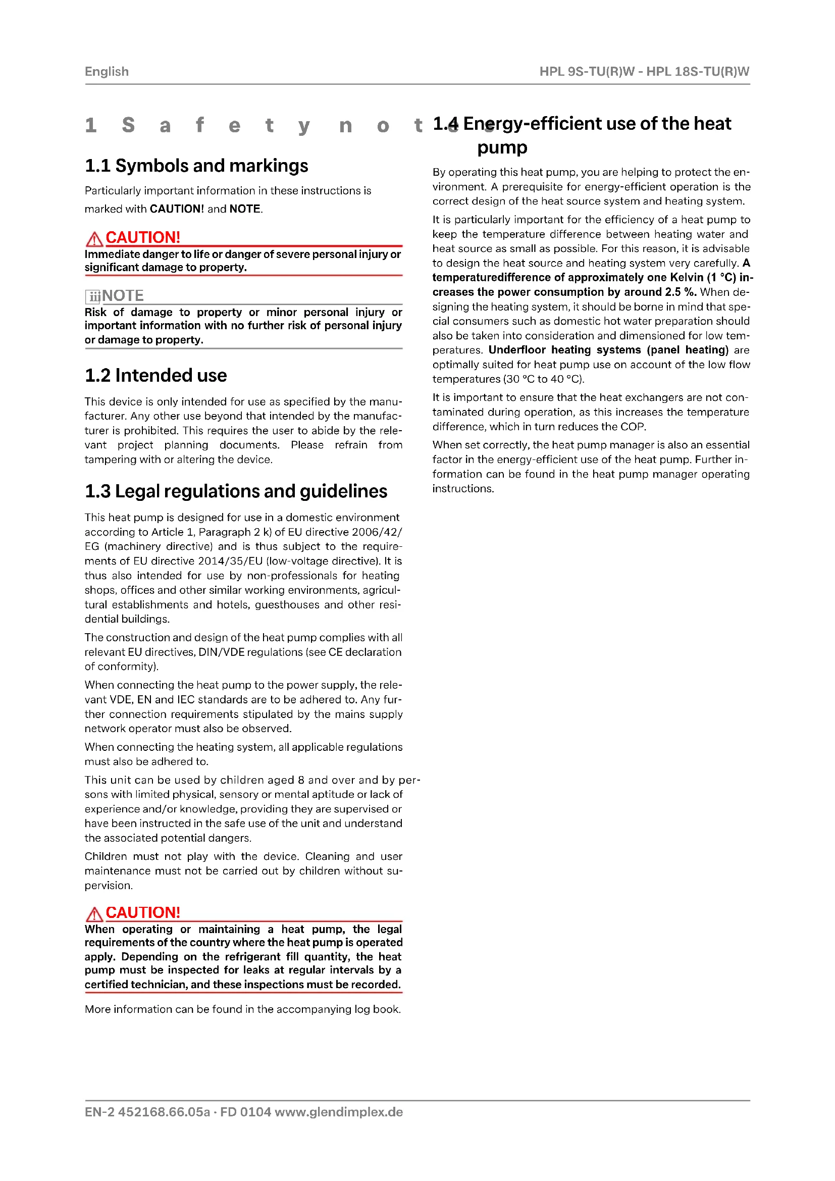 10.Note that additional space is required for pipe connections, operation and maintenance. 11.See CE declaration of conformity 12.The heat circulating pump and the heat pump manager must always be ready for operation. 13.The coefficient of performance (COP) in partial load operation can be increased by selecting "energy-optimised heating operation" (natural defrosting)EN-12 452168.66.05a · FD 0104 www.glendimplex.de English HPL 9S-TU(R)W - HPL 18S-TU(R)W 1 Type and order code