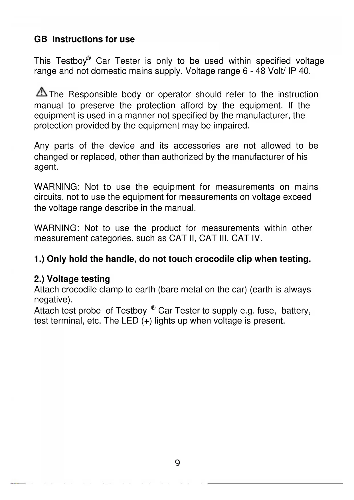 Car Tester on positive pole. The LED (+) lights up when voltage is present. 4.) Hedlight / rearlight test Attach crocodile clamp to earth and test probe to lamp socket. 5.) Testing leads Attach crocodile clamp to earth. Pull back pin by means of push mechanism, clamp the car lead into wedge and pierce with pin, the LED (+) lights up when voltage is present. After voltage test minute hole in lead closes again. 6.) Lead test positive / negative Pierce car lead, attach crocodile clamp to positive or negative pole of battery. The LED (+) lights up when placed on a negative pole, thus showing that a positive lead is present. The reverse being the case for a negative lead. Declaration of conformity The product conforms to the most recent directives. For more infor- mation, go to www.testboy.de Fields of application The tool is intended for use in applications as described in the operating instructions only. Any other form of usage is not permitted and can lead to accidents or destruction of the device. Any misuse will result in the expiry of all guarantee and warranty claims on the part of the operator against the manufacturer.11
