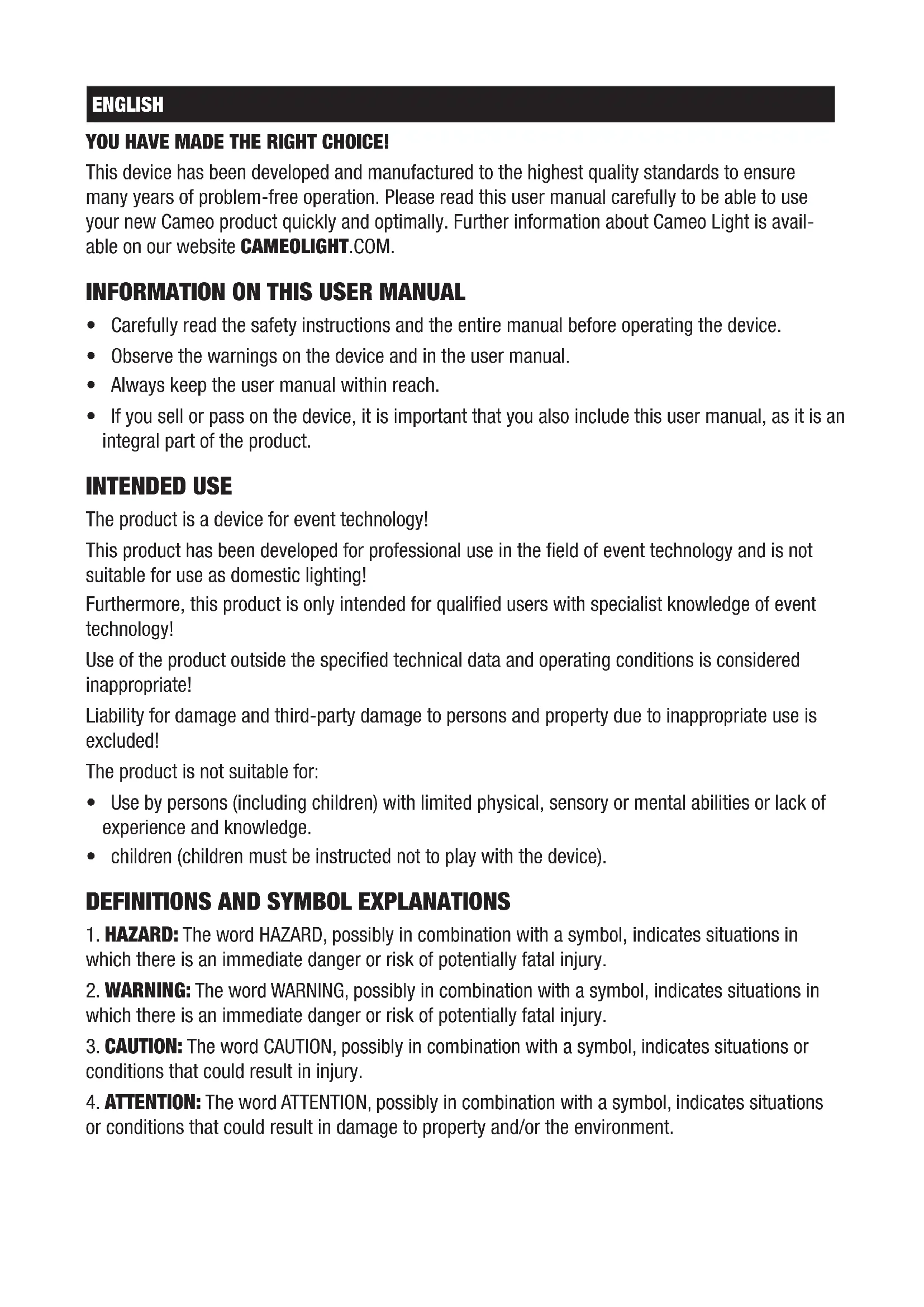 YOU HAVE MADE THE RIGHT CHOICE! This device has been developed and manufactured to the highest quality standards to ensure many years of problem-free operation. Please read this user manual carefully to be able to use your new Cameo product quickly and optimally. Further information about Cameo Light is avail- able on our website CAMEOLIGHT.COM.