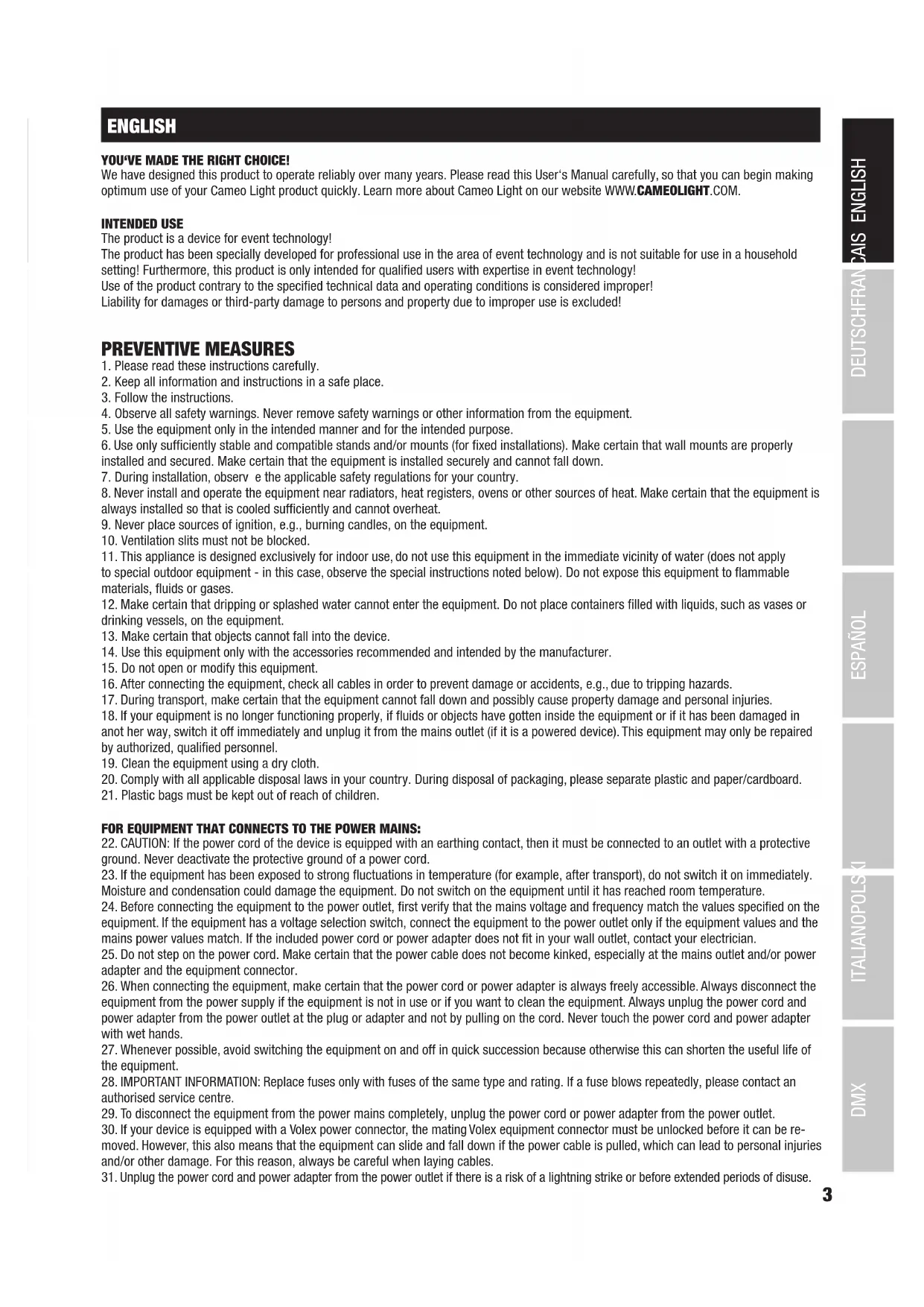 FOR EQUIPMENT THAT CONNECTS TO THE POWER MAINS: 22. CAUTION: If the power cord of the device is equipped with an earthing contact, then it must be connected to an outlet with a protective ground. Never deactivate the protective ground of a power cord. 23. If the equipment has been exposed to strong fluctuations in temperature (for example, after transport), do not switch it on immediately. Moisture and condensation could damage the equipment. Do not switch on the equipment until it has reached room temperature. 24. Before connecting the equipment to the power outlet, first verify that the mains voltage and frequency match the values specified on the equipment. If the equipment has a voltage selection switch, connect the equipment to the power outlet only if the equipment values and the mains power values match. If the included power cord or power adapter does not fit in your wall outlet, contact your electrician. 25. Do not step on the power cord. Make certain that the power cable does not become kinked, especially at the mains outlet and/or power adapter and the equipment connector. 26. When connecting the equipment, make certain that the power cord or power adapter is always freely accessible. Always disconnect the equipment from the power supply if the equipment is not in use or if you want to clean the equipment. Always unplug the power cord and power adapter from the power outlet at the plug or adapter and not by pulling on the cord. Never touch the power cord and power adapter with wet hands. 27. Whenever possible, avoid switching the equipment on and off in quick succession because otherwise this can shorten the useful life of the equipment. 28. IMPORTANT INFORMATION: Replace fuses only with fuses of the same type and rating. If a fuse blows repeatedly, please contact an authorised service centre. 29. To disconnect the equipment from the power mains completely, unplug the power cord or power adapter from the power outlet. 30. If your device is equipped with a Volex power connector, the mating Volex equipment connector must be unlocked before it can be re- moved. However, this also means that the equipment can slide and fall down if the power cable is pulled, which can lead to personal injuries and/or other damage. For this reason, always be careful when laying cables. 31. Unplug the power cord and power adapter from the power outlet if there is a risk of a lightning strike or before extended periods of disuse.4 DMX ITALIANO POLSKI ESPAÑOL FRANCAIS DEUTSCHENGLISH