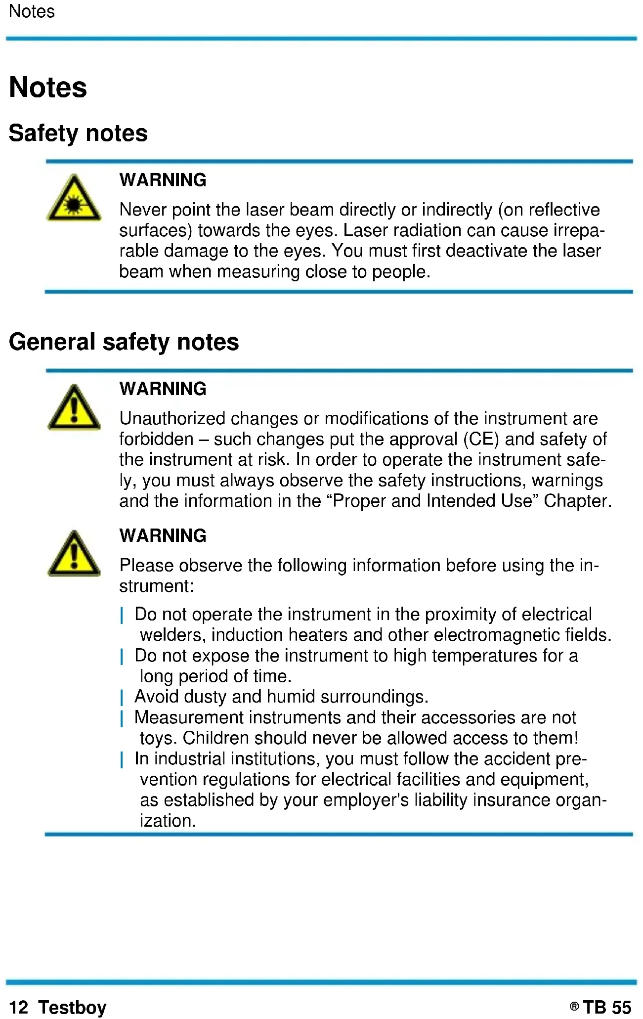 WARNING Please observe the following information before using the in- strument: | Do not operate the instrument in the proximity of electrical welders, induction heaters and other electromagnetic fields. | Do not expose the instrument to high temperatures for a long period of time. | Avoid dusty and humid surroundings. | Measurement instruments and their accessories are not toys. Children should never be allowed access to them! | In industrial institutions, you must follow the accident pre- vention regulations for electrical facilities and equipment, as established by your employer's liability insurance organ- ization.Notes Testboy