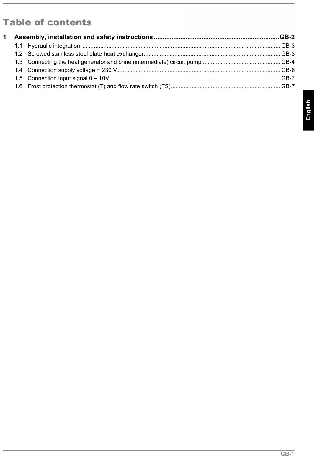 heat exchanger Requirements on the installation area: Sufficient space must be left free around the plate heat ex- changer for maintenance (replacing plates, tightening the pack- age). The free space should usually be around 1.5 to 2 x the width of the heat exchanger. Transport, lifting the plate heat exchanger: The heat exchanger is delivered screwed to a plate. The follow- ing points must be observed when lifting the device: Remove the fixing screws from the pallet. Attach a strap around a bolt on each side. Never use steel cables or chains! Lift the heat exchanger from the pallet, lower it horizontally onto its feet and position in its end position on solid ground, fix in place if necessary! ATTENTION! Never lift the heat exchanger by the connections or surrounding stud bolts! Always use the lifting lugs (if present) or lift on the top side of the front pallet. Fix the straps onto their bolts for this.GB-4 English