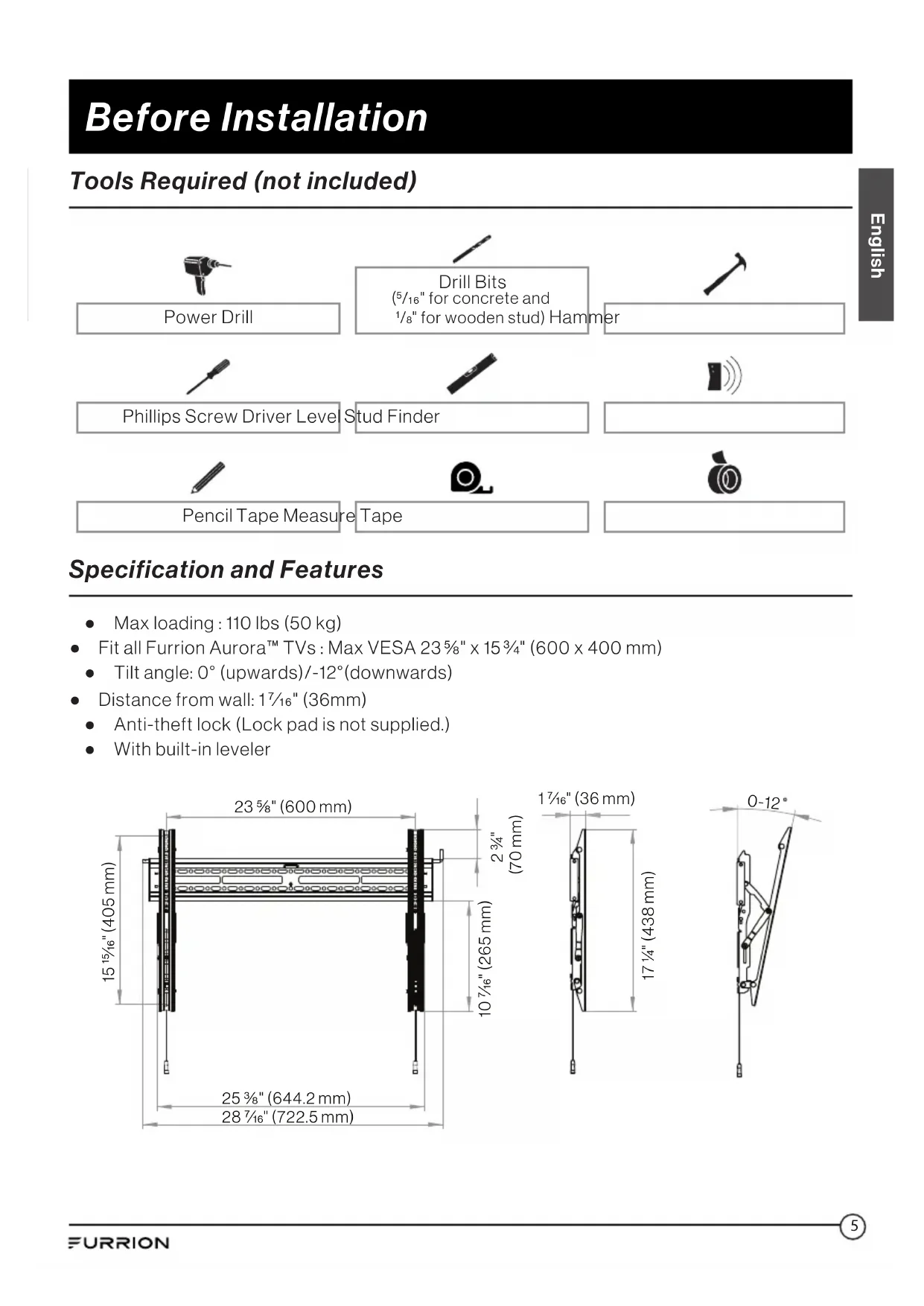 (A) lag bolt ST8*63 (x 4) & metal clip (x 1) (B) washer Φ9.5*Φ21*2.0 (x 4) (C) anchor Φ10*50/PA6 (x 6) (D) Phillips bolt M6*16 (x 4) (E) Phillips bolt M6*18 (x 4) (F) Phillips bolt M6*25 (x 4) (G) washer Φ6.4*Φ18*1.5 (x 4) (H) Phillips bolt M8*18 (x 4) (I) Phillips bolt M8*25 (x 4) (J) washer Φ8.4*Φ19*2.0 (x 4) (K) spacer Φ8*Φ18*10 (x 8) English5 Before Installation English Tools Required (not included) Power Drill Drill Bits (/" for concrete and /" for wooden stud) Hammer Phillips Screw Driver Level Stud Finder Pencil Tape Measure Tape Specification and Features ● Max loading : 110 lbs (50 kg) ● Fit all Furrion Aurora™ TVs : Max VESA 23⅝" x 15" (600 x 400 mm) ● Tilt angle: 0° (upwards)/-12°(downwards) ● Distance from wall: 1" (36mm) ● Anti-theft lock (Lock pad is not supplied.) ● With built-in leveler 23 ⅝" (600 mm) 2 ¾" (70 mm) 28 " (722.5 mm) 15 " (405 mm) 10 " (265 mm) 25 ⅜" (644.2 mm) 17 ¼" (438 mm) 1 " (36 mm) 0-126 Installation English Step 1. Mount the Wall Plate on Wall