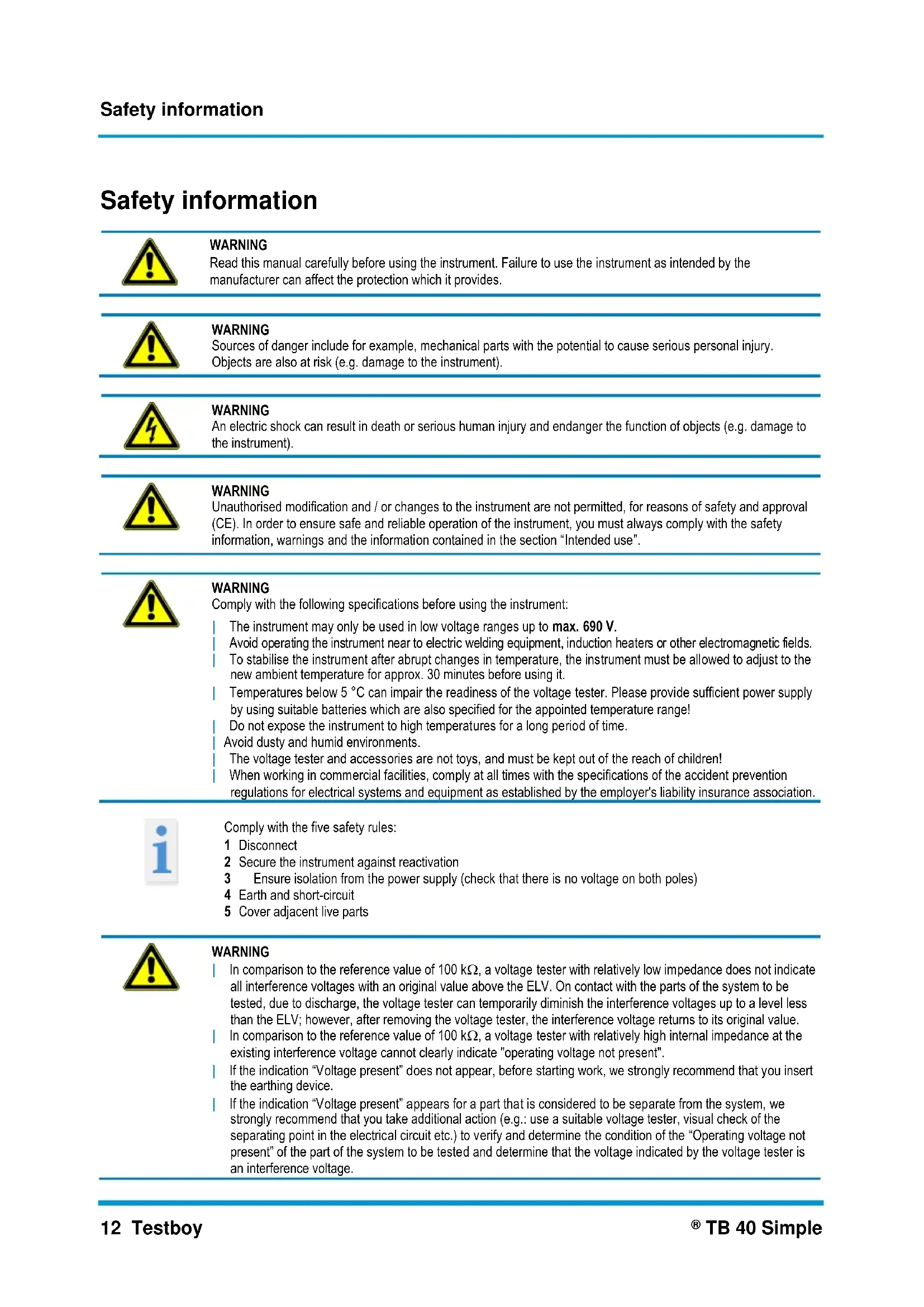 TB 40 Simple means that it can also be used under harsh conditions. Safety information You have chosen an instrument providing a high degree of safety. In order to ensure safe and correct application, read read this operating manual completely before first use. The following safety precautions apply: | Perform a function check of the voltage tester immediately before use (VDE regulation 0105, Part 1). Make sure that the test line and instrument are fully serviceable. Check the instrument on a known source of voltage, e.g. 230 V socket. | If the display fails to indicate one or more functions during this test, do not use the instrument. It must be checked by a specialist. | Only hold the instrument on the handles below the mechanical mark; avoid contact with the probes! | Only perform tests for isolation from the power supply on both poles! | The instrument must not be operated in a damp environment! | Do not use with the battery compartment open! Whilst replacing the battery, the probes must be removed from the test circuit. | A correct display is ensured in the temperature range of -15 °C to +55 °C. | Always keep the instrument dry and clean. Only use a moist cloth to clean the housing. | The additional warning symbol and signal with for voltages > 40 V serve only to warn of hazardous voltages, not for test purposes! | Replace the batteries immediately if a warning signal sounds shortly after switching on the instrument, or when the instrument is switched on and immediately switches off. | The various signals displayed by the voltage tester (including the ELV limit value) may not be used for measurement purposes.