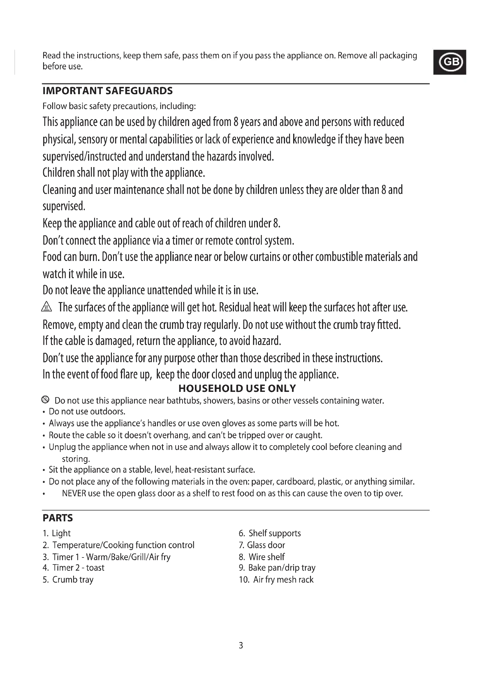 Read the instructions, keep them safe, pass them on if you pass the appliance on. Remove all packaging before use. IMPORTANT SAFEGUARDS Follow basic safety precautions, including: This appliance can be used by children aged from 8 years and above and persons with reduced physical, sensory or mental capabilities or lack of experience and knowledge if they have been supervised/instructed and understand the hazards involved. Children shall not play with the appliance. Cleaning and user maintenance shall not be done by children unless they are older than 8 and supervised. Keep the appliance and cable out of reach of children under 8. Don’t connect the appliance via a timer or remote control system. Food can burn. Don’t use the appliance near or below curtains or other combustible materials and watch it while in use. Do not leave the appliance unattended while it is in use. ¬ The surfaces of the appliance will get hot. Residual heat will keep the surfaces hot after use. Remove, empty and clean the crumb tray regularly. Do not use without the crumb tray tted. If the cable is damaged, return the appliance, to avoid hazard. Don’t use the appliance for any purpose other than those described in these instructions. In the event of food are up, keep the door closed and unplug the appliance.
