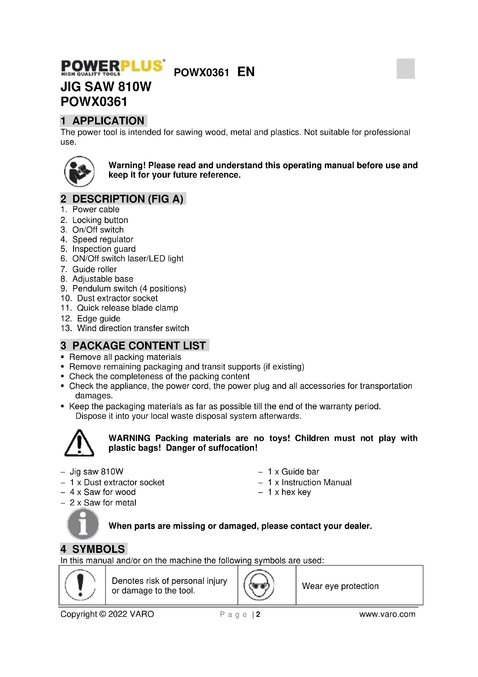 POWX0361 1 APPLICATION The power tool is intended for sawing wood, metal and plastics. Not suitable for professional use. Warning! Please read and understand this operating manual before use and keep it for your future reference. 2 DESCRIPTION (FIG A)