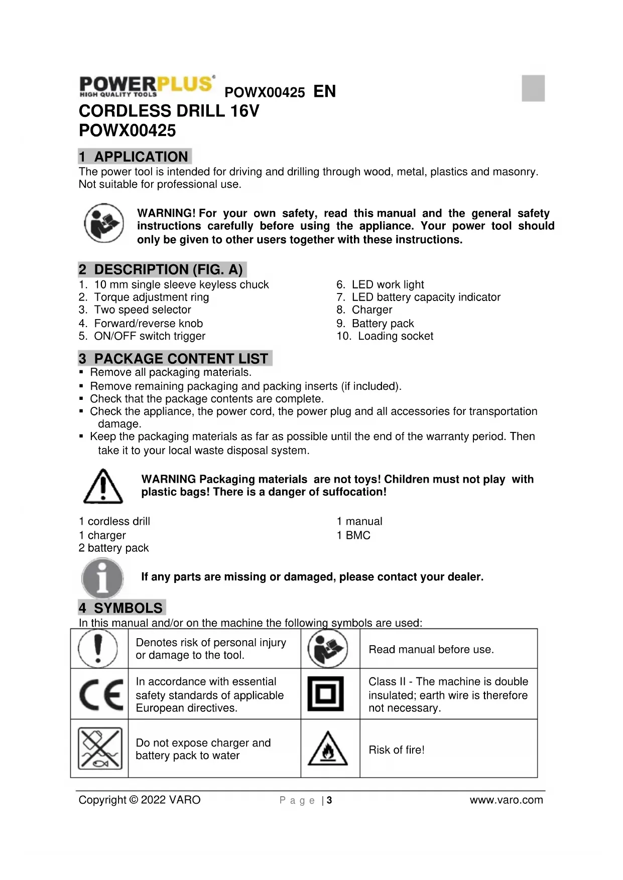 VARO N.V. - Vic. Van Rompuy N.V.- Joseph Van Instraat 9 - BE2500 Lier - BELGIUM, declares that, Product: Cordless Drill trade mark: POWERplus model : POWX00425 is in conformity with the essential requirements and other relevant provisions of the applicable European Directives, based on the application of European harmonized standards. Any unauthorized modification of the apparatus voids this declaration. European Directives (including, if applicable, their amendments up to the date of signature); 2014/30/EU 2006/42/EC 2011/65/EU European harmonized standards (including, if applicable, their amendments up to the date of signature); EN62841-1 : 2015 EN62841-2-1 : 2018 EN55014-1 : 2017 EN55014-2 : 2015 Keeper of the Technical Documentation : Philippe Vankerkhove, VARO – Vic. Van Rompuy N.V. The undersigned acts on behalf of the company CEO, Ludo Mertens Regulatory Affairs – Compliance Manager 22/12/2021, Lier - BelgiumPOWX00425 DE Copyright © 2022 VARO S e i t e | 1 www.varo.com 1 EINSATZBEREICH ......................................................................... 3