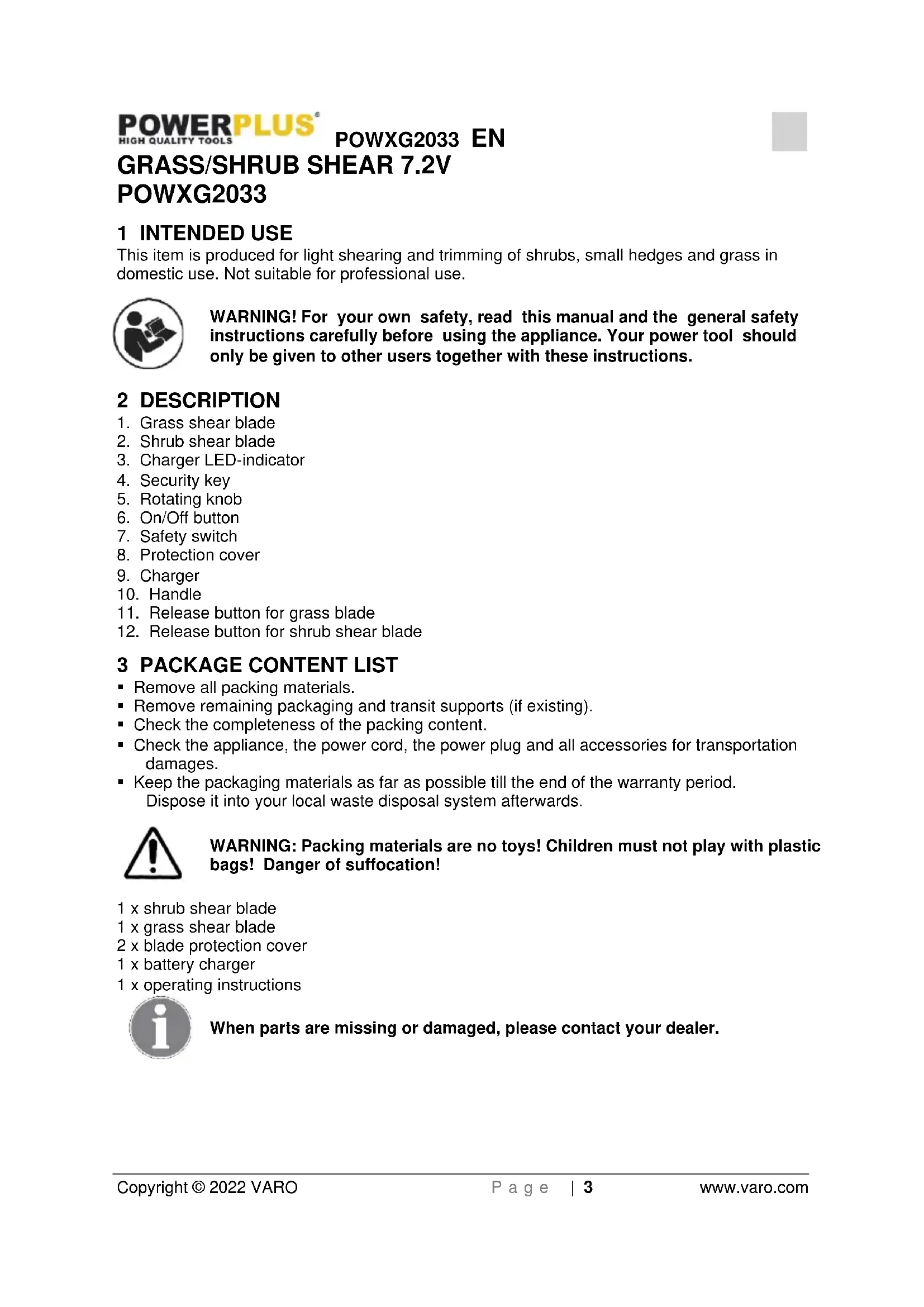 bags! Danger of suffocation! 1 x shrub shear blade 1 x grass shear blade 2 x blade protection cover 1 x battery charger 1 x operating instructions When parts are missing or damaged, please contact your dealer.POWXG2033 EN Copyright © 2022 VARO P a g e | 4 www.varo.com