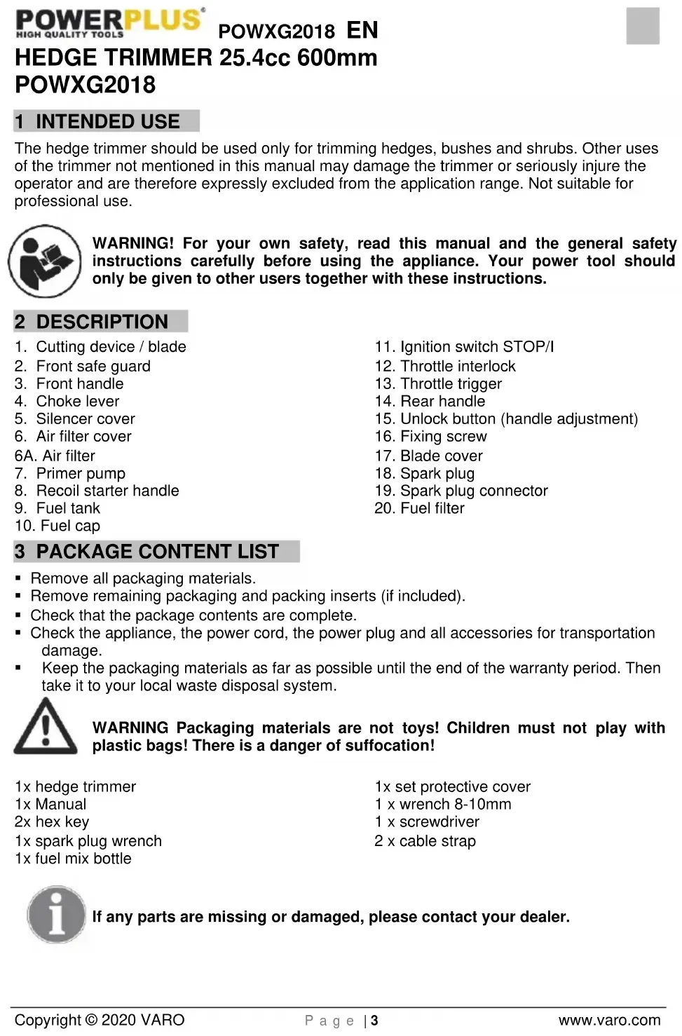 - Keep the packaging materials as far as possible until the end of the warranty period. Then take it to your local waste disposal system. WARNING Packaging materials are not toys! Children must not play with plastic bags! There is a danger of suffocation! 1x hedge trimmer 1x Manual 2x hex key 1x spark plug wrench 1x fuel mix bottle 1x set protective cover 1 x wrench 8-10mm 1 x screwdriver 2 x cable strap If any parts are missing or damaged, please contact your dealer.POWXG2018 EN Copyright © 2023 VARO P a g e | 4 www.varo.com 4 SYMBOLS The following symbols are used in this manual and/or on the machine: