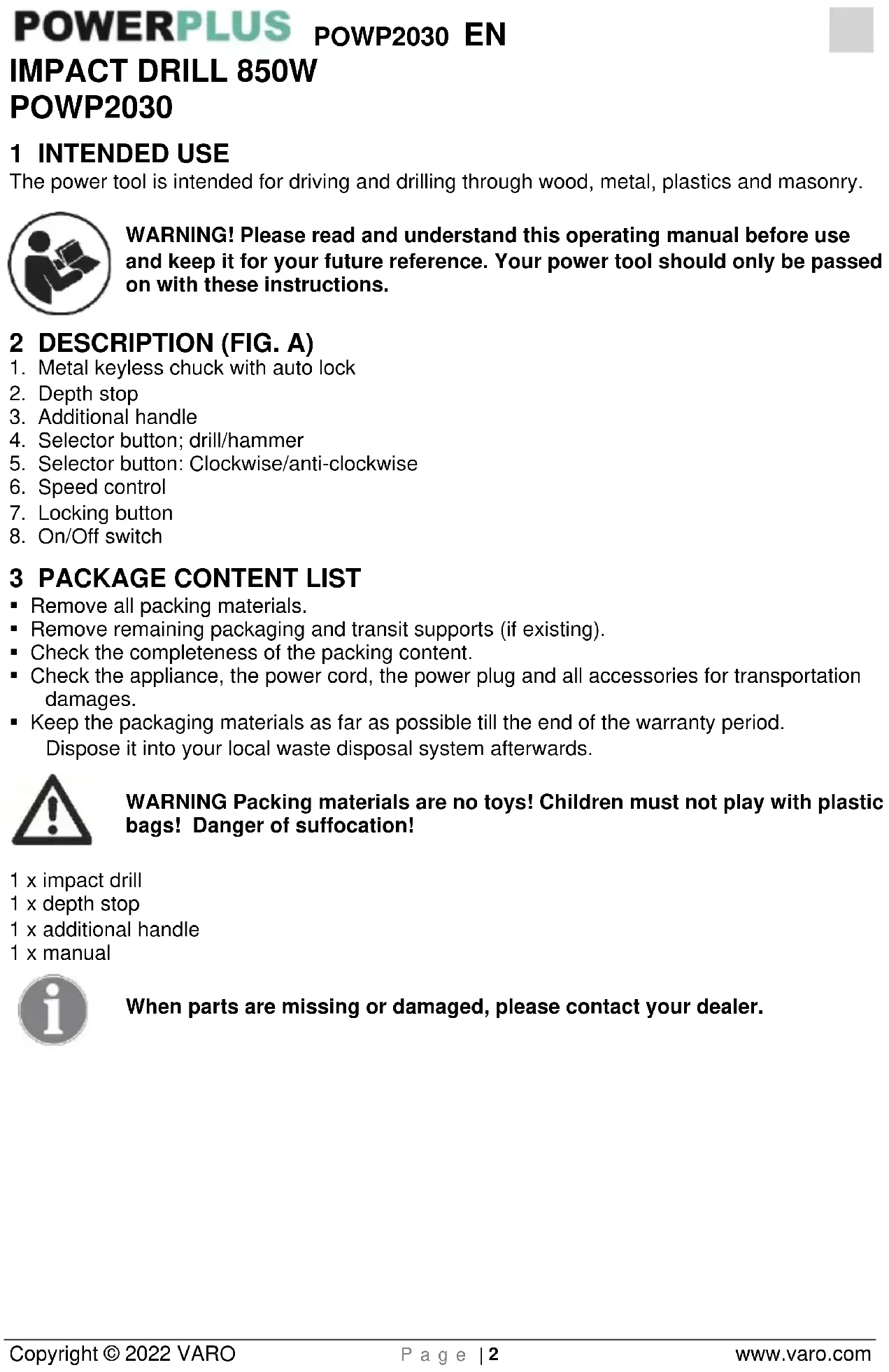 - Keep the packaging materials as far as possible till the end of the warranty period. Dispose it into your local waste disposal system afterwards. WARNING Packing materials are no toys! Children must not play with plastic bags! Danger of suffocation! 1 x impact drill 1 x depth stop 1 x additional handle 1 x manual When parts are missing or damaged, please contact your dealer.POWP2030 EN Copyright © 2022 VARO P a g e | 3 www.varo.com 4 SYMBOLS The following symbols are used in this manual and/or on the machine: