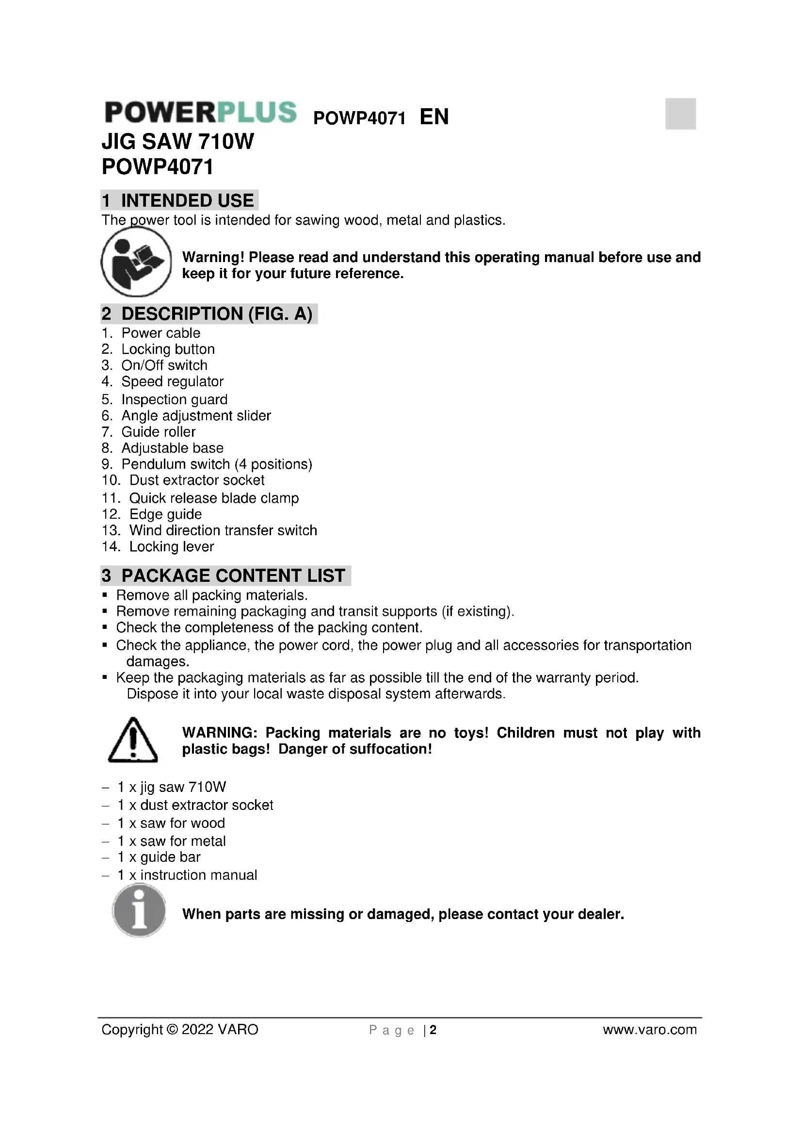 plastic bags! Danger of suffocation! − 1 x jig saw 710W − 1 x dust extractor socket − 1 x saw for wood − 1 x saw for metal − 1 x guide bar − 1 x instruction manual When parts are missing or damaged, please contact your dealer.POWP4071 EN Copyright © 2022 VARO P a g e | 3 www.varo.com 4 SYMBOLS In this manual and/or on the machine the following symbols are used: