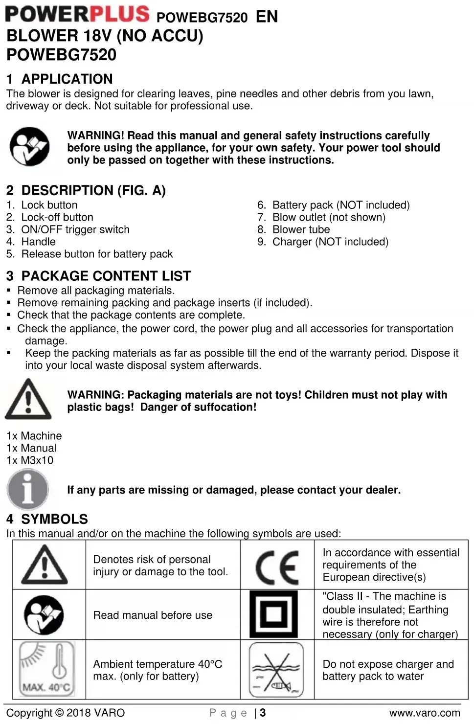 VARO N.V. - Joseph Van Instraat 9 - BE2500 Lier - BELGIUM, declares that, Product: BLower 18V Trade mark: POWERplus Model: POWEBG7520 is in conformity with the essential requirements and other relevant provisions of the applicable European Directives, based on the application of European harmonized standards. Any unauthorized modification of the apparatus voids this declaration. European Directives (including, if applicable, their amendments up to the date of signature); 2011/65/EU 2006/42/EC 2014/30/EU 2000/14/EC Annex V LwA 91dB(A) / 95dB(A) European harmonized standards (including, if applicable, their amendments up to the date of signature); EN60335-1: 2012 EN50636-2-100: 2014 EN62233: 2008 EN55014-1: 2006 EN55014-2: 2015 Keeper of the Technical Documentation : Philippe Vankerkhove, VARO – Vic. Van Rompuy N.V. The undersigned acts on behalf of the company CEO, Eric de Boer Regulatory Affairs – Compliance Manager 24/10/2017POWEBG7520 DE Copyright © 2018 VARO S e i t e | 1 www.varo.com 1 EINSATZBEREICH ......................................................................... 3
