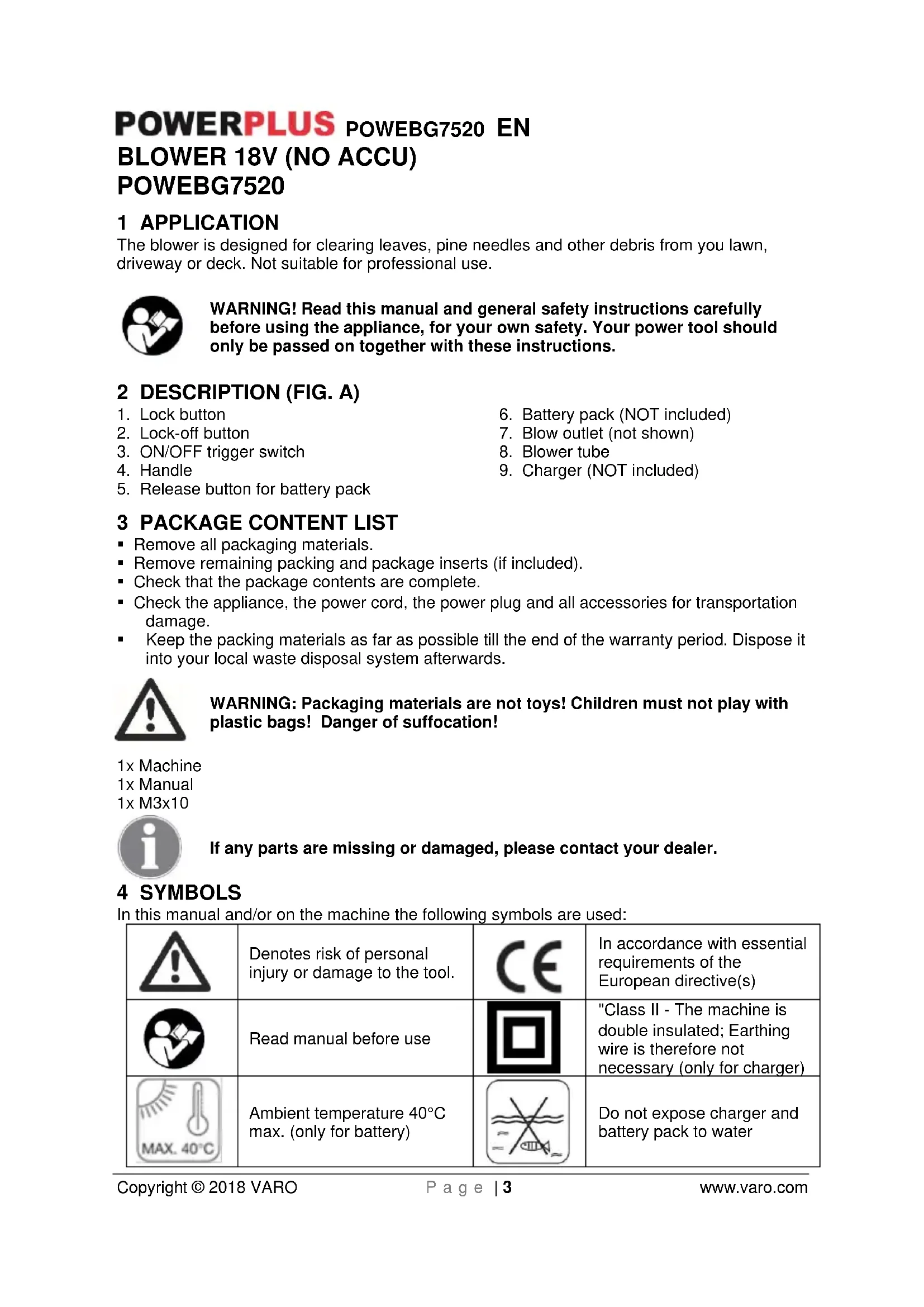 VARO N.V. - Joseph Van Instraat 9 - BE2500 Lier - BELGIUM, declares that, Product: BLower 18V Trade mark: POWERplus Model: POWEBG7520 is in conformity with the essential requirements and other relevant provisions of the applicable European Directives, based on the application of European harmonized standards. Any unauthorized modification of the apparatus voids this declaration. European Directives (including, if applicable, their amendments up to the date of signature); 2011/65/EU 2006/42/EC 2014/30/EU 2000/14/EC Annex V LwA 91dB(A) / 95dB(A) European harmonized standards (including, if applicable, their amendments up to the date of signature); EN60335-1: 2012 EN50636-2-100: 2014 EN62233: 2008 EN55014-1: 2006 EN55014-2: 2015 Keeper of the Technical Documentation : Philippe Vankerkhove, VARO – Vic. Van Rompuy N.V. The undersigned acts on behalf of the company CEO, Eric de Boer Regulatory Affairs – Compliance Manager 24/10/2017POWEBG7520 DE Copyright © 2018 VARO S e i t e | 1 www.varo.com 1 EINSATZBEREICH ......................................................................... 3