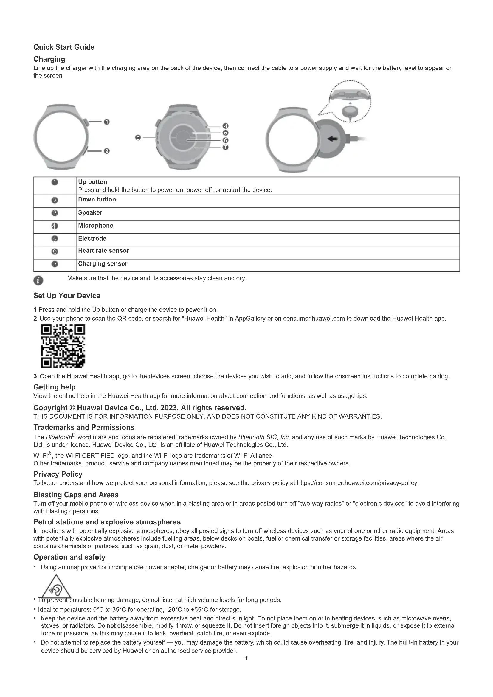 Charging sensor Make sure that the device and its accessories stay clean and dry. Set Up Your Device 1 Press and hold the Up button or charge the device to power it on. 2 Use your phone to scan the QR code, or search for "Huawei Health" in AppGallery or on consumer.huawei.com to download the Huawei Health app. 3 Open the Huawei Health app, go to the devices screen, choose the devices you wish to add, and follow the onscreen instructions to complete pairing. Getting help View the online help in the Huawei Health app for more information about connection and functions, as well as usage tips. Copyright © Huawei Device Co., Ltd. 2023. All rights reserved. THIS DOCUMENT IS FOR INFORMATION PURPOSE ONLY, AND DOES NOT CONSTITUTE ANY KIND OF WARRANTIES. Trademarks and Permissions The Bluetooth