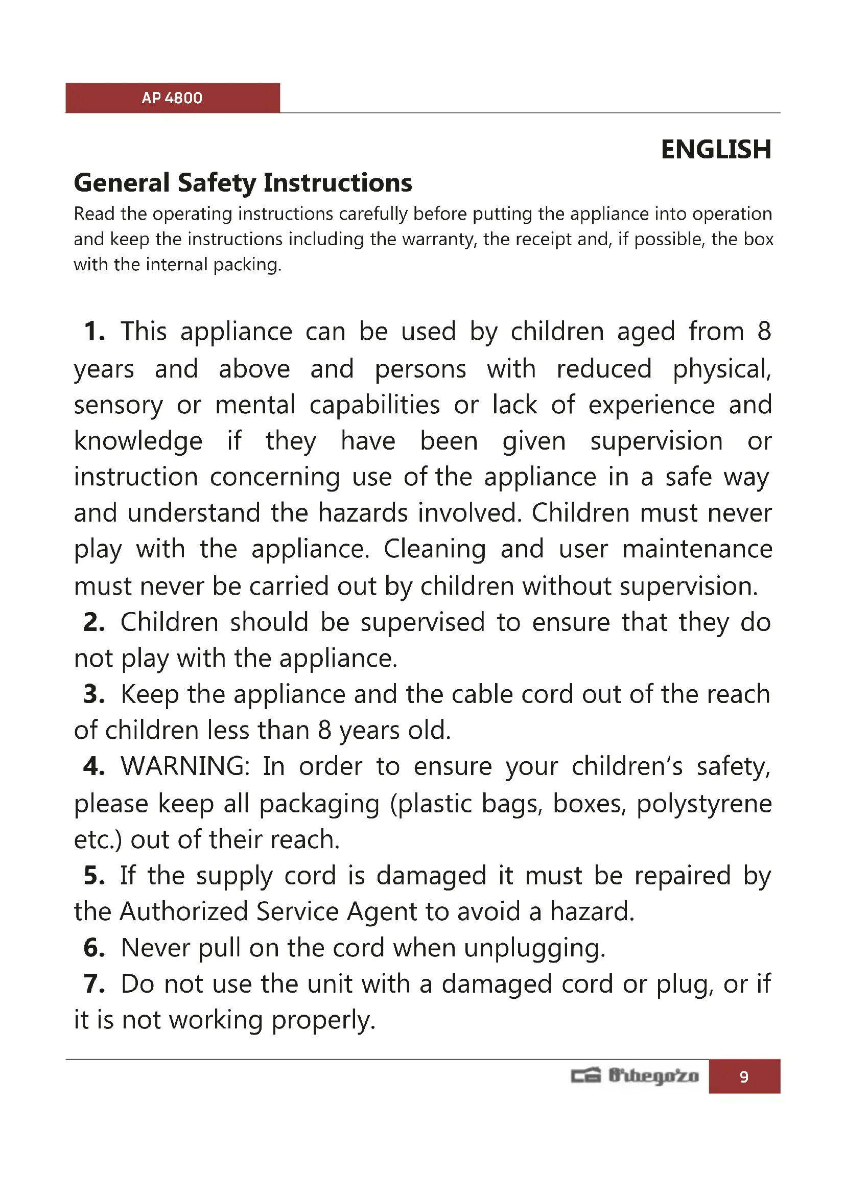 possible injury. Information for this unit Vacuum only dust and small crumbs. Do not vacuum sharp objects, liquids or hot ashes. This appliance is only intended for household use and for this end has been manufactured. The appliance is to be used with the power supply unit supplied with the unit.AP 4800