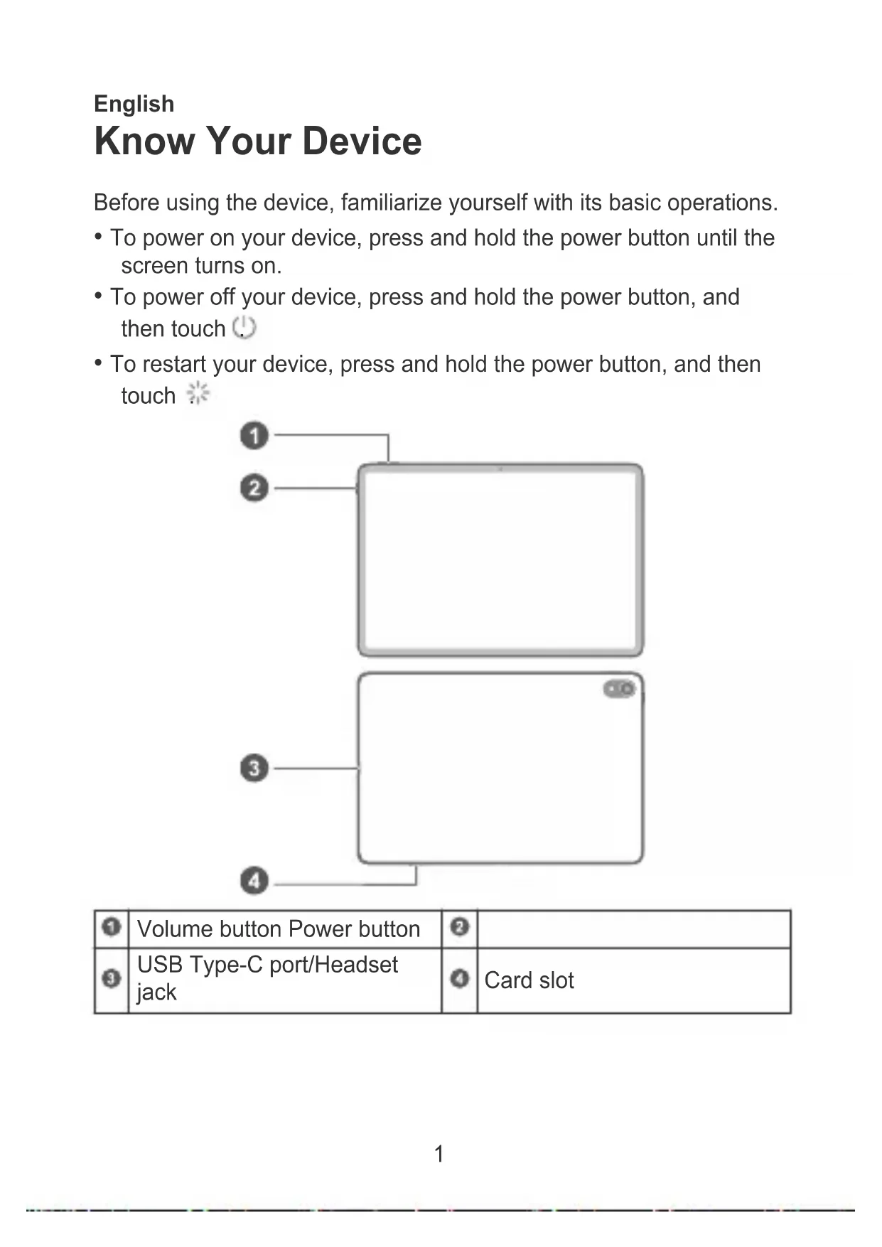 - To restart your device, press and hold the power button, and then touch . Volume button Power button USB Type-C port/Headset jack Card slot 1Getting Started
