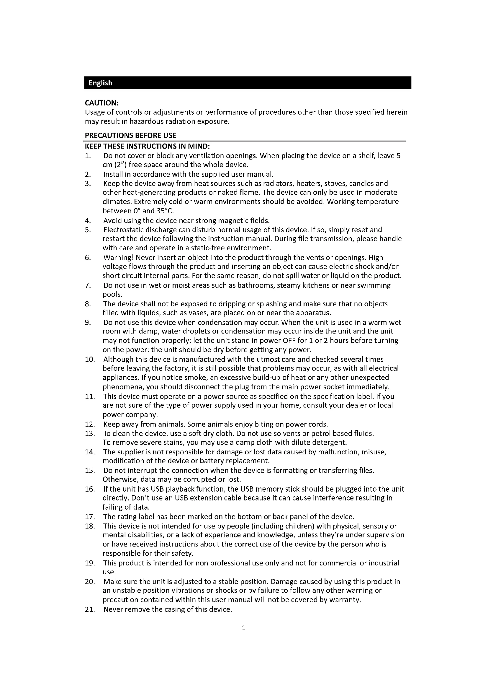 21. Never remove the casing of this device.2