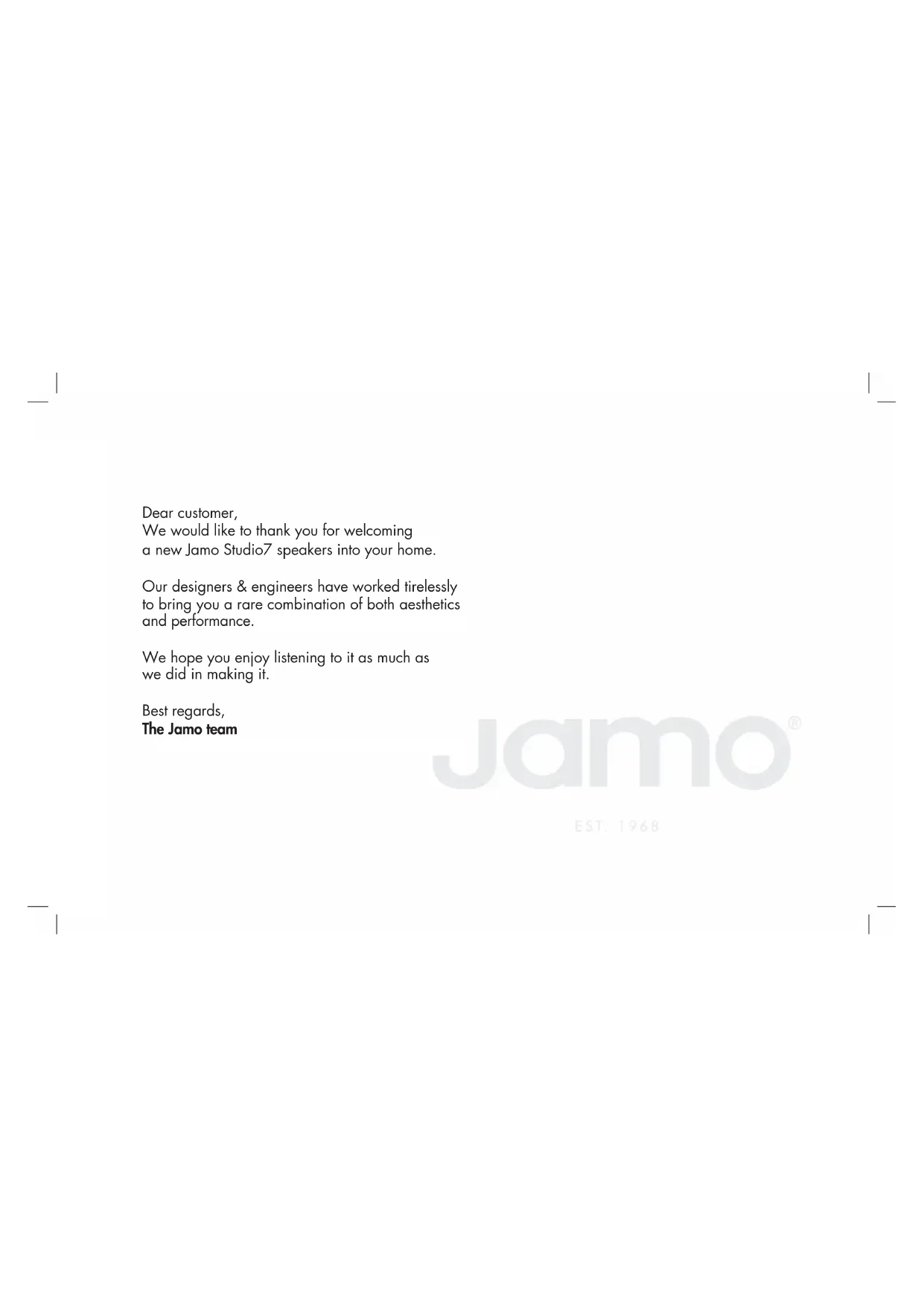 www.jamo.com Jamo Corporate Office: 3502 Woodview Trace, Indianapolis, IN, USA 46268-1104. A wholly-owned subsidiary of VOXX International Corporation, jamo.com 1-800-554-7724 © 2022 Klipsch Group, Inc. All rights reserved. Jamo is a registered trademark of Klipsch Group, Inc. Engineered by Klipsch Group, Inc., USA. Made in China.