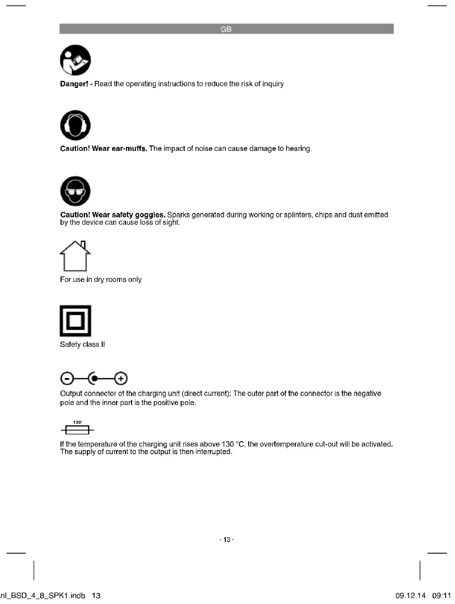 Danger! - Read the operating instructions to reduce the risk of inquiry Caution! Wear ear-muff s. The impact of noise can cause damage to hearing. Caution! Wear safety goggles. Sparks generated during working or splinters, chips and dust emitted by the device can cause loss of sight. For use in dry rooms only Safety class II Output connector of the charging unit (direct current): The outer part of the connector is the negative pole and the inner part is the positive pole. 130° If the temperature of the charging unit rises above 130 °C, the overtemperature cut-out will be activated. The supply of current to the output is then interrupted. Anl_BSD_4_8_SPK1.indb 13Anl_BSD_4_8_SPK1.indb 13 09.12.14 09:1109.12.14 09:11GB