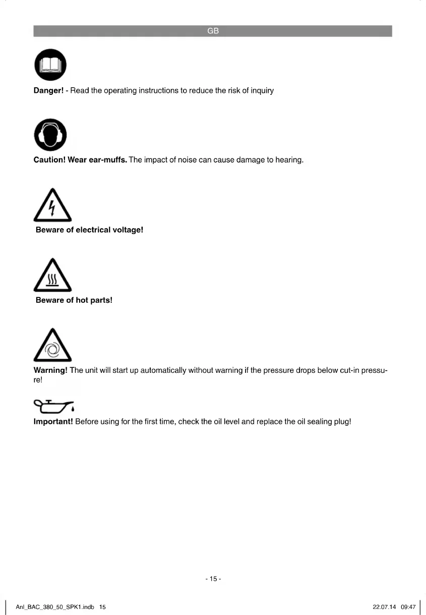 Caution! Wear ear-muff s. The impact of noise can cause damage to hearing. Danger! - Read the operating instructions to reduce the risk of inquiry Beware of electrical voltage! Beware of hot parts! Warning! The unit will start up automatically without warning if the pressure drops below cut-in pressu- re! Important! Before using for the fi rst time, check the oil level and replace the oil sealing plug! Anl_BAC_380_50_SPK1.indb 15Anl_BAC_380_50_SPK1.indb 15 22.07.14 09:4722.07.14 09:47GB