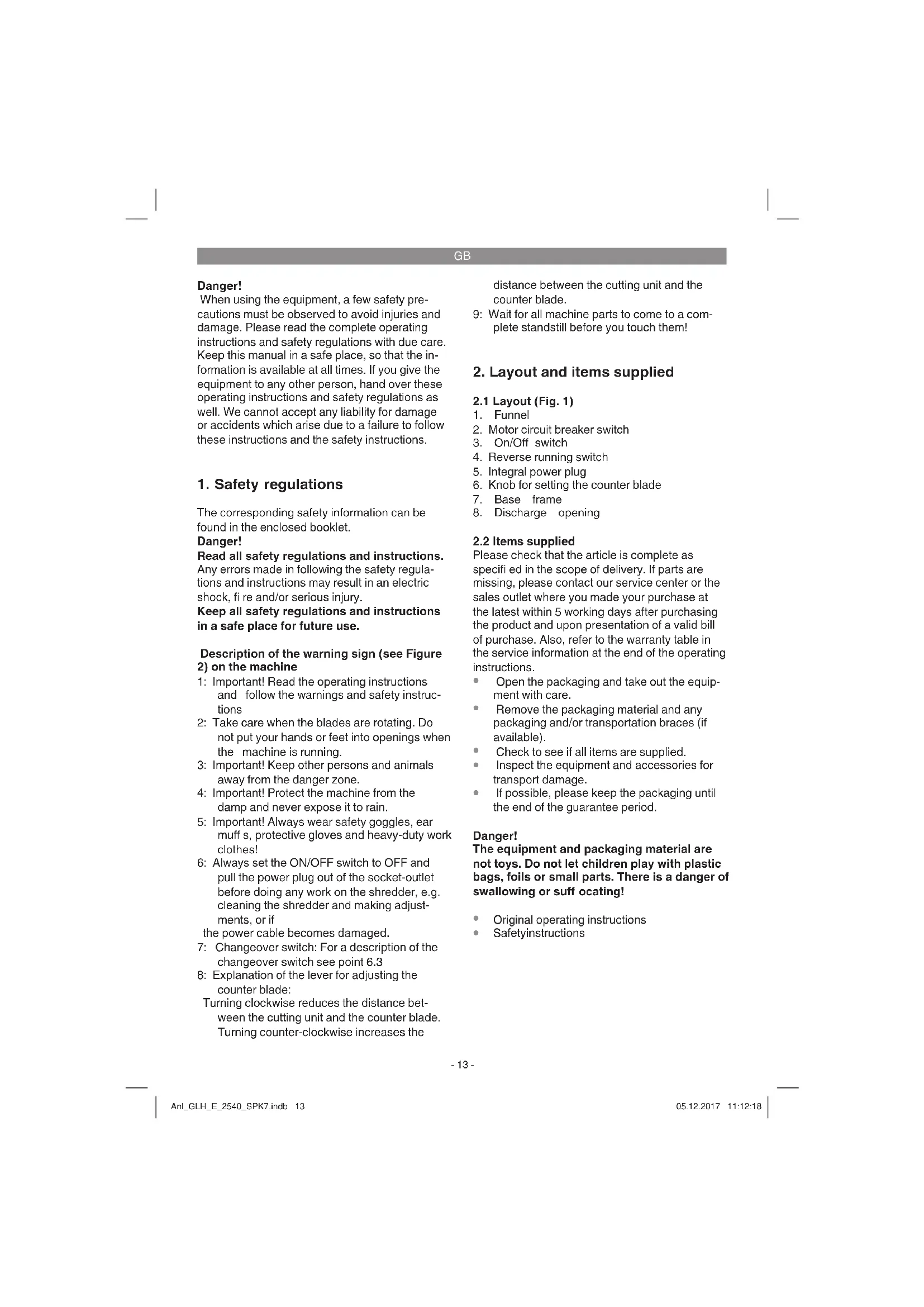 1: Important! Read the operating instructions and follow the warnings and safety instruc- tions 2: Take care when the blades are rotating. Do not put your hands or feet into openings when the machine is running. 3: Important! Keep other persons and animals away from the danger zone. 4: Important! Protect the machine from the damp and never expose it to rain. 5: Important! Always wear safety goggles, ear muff s, protective gloves and heavy-duty work clothes! 6: Always set the ON/OFF switch to OFF and pull the power plug out of the socket-outlet before doing any work on the shredder, e.g. cleaning the shredder and making adjust- ments, or if the power cable becomes damaged. 7: Changeover switch: For a description of the changeover switch see point 6.3 8: Explanation of the lever for adjusting the counter blade: Turning clockwise reduces the distance bet- ween the cutting unit and the counter blade. Turning counter-clockwise increases the distance between the cutting unit and the counter blade. 9: Wait for all machine parts to come to a com- plete standstill before you touch them!