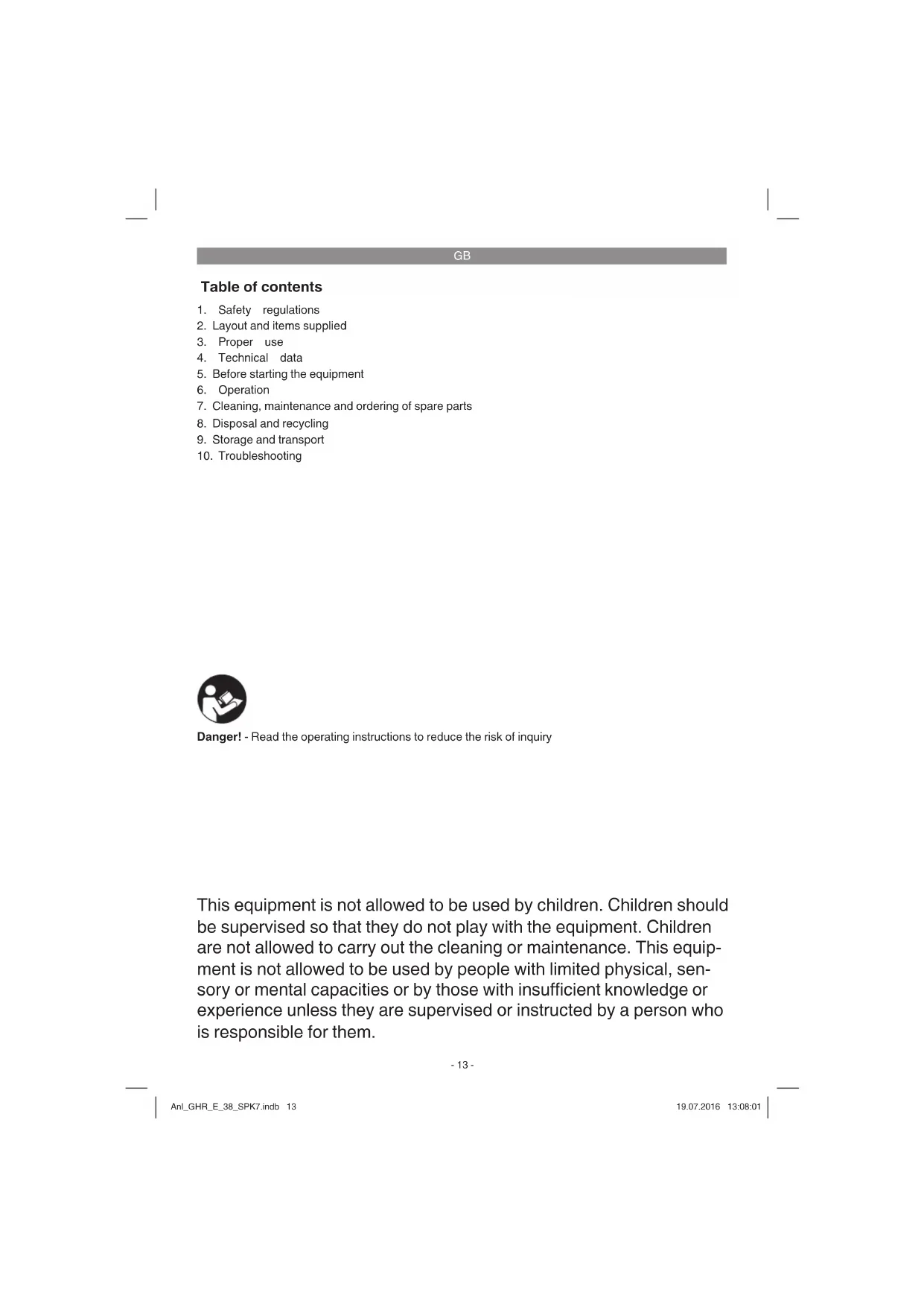 This equipment is not allowed to be used by children. Children should be supervised so that they do not play with the equipment. Children are not allowed to carry out the cleaning or maintenance. This equip- ment is not allowed to be used by people with limited physical, sen- sory or mental capacities or by those with insuffi cient knowledge or experience unless they are supervised or instructed by a person who is responsible for them. Danger! - Read the operating instructions to reduce the risk of inquiry Anl_GHR_E_38_SPK7.indb 13Anl_GHR_E_38_SPK7.indb 13 19.07.2016 13:08:0119.07.2016 13:08:01GB