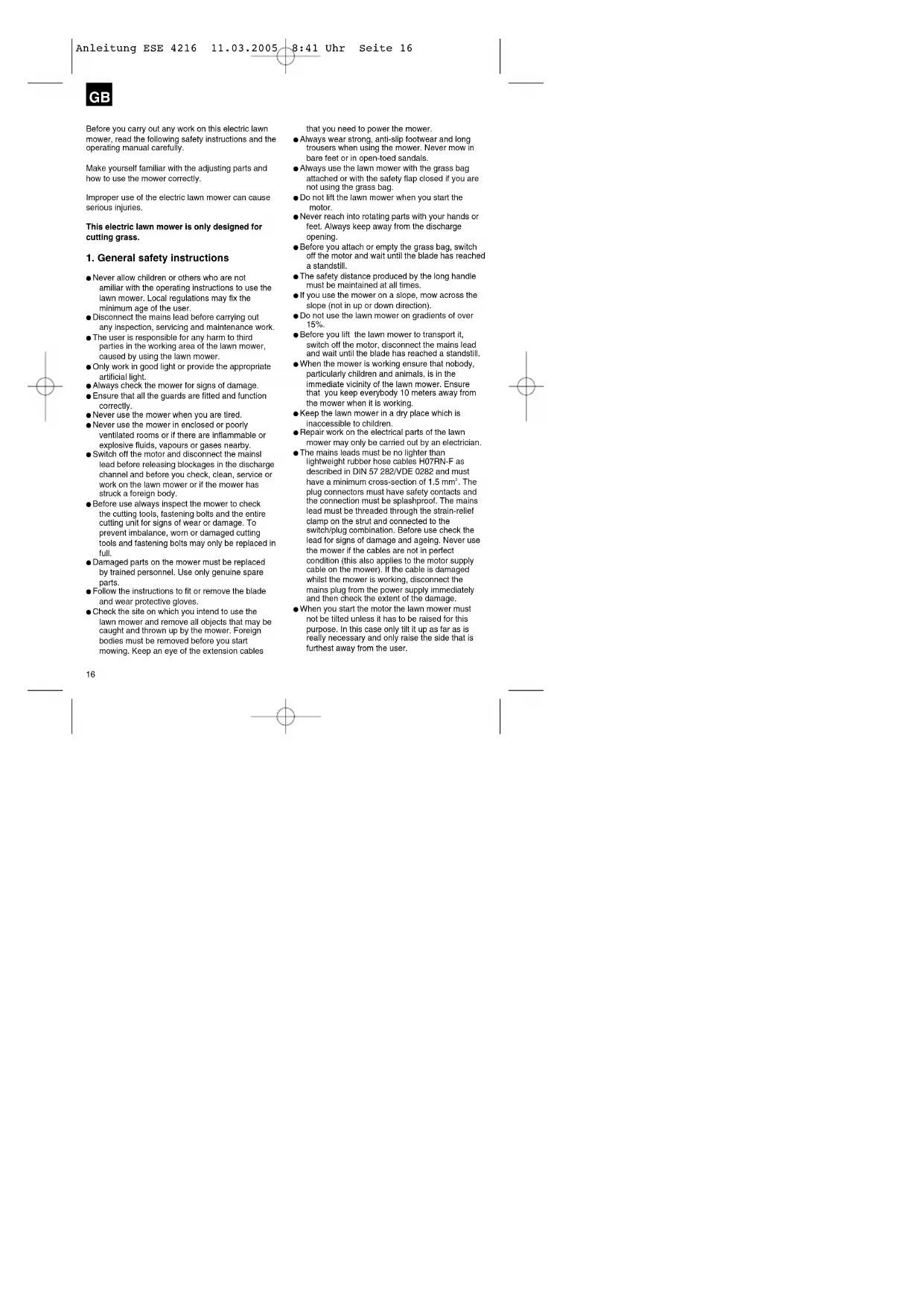 Anleitung ESE 4216 11.03.2005 8:41 Uhr Seite 15Before you carry out any work on this electric lawn mower, read the following safety instructions and the operating manual carefully. Make yourself familiar with the adjusting parts and how to use the mower correctly. Improper use of the electric lawn mower can cause serious injuries. This electric lawn mower is only designed for cutting grass.