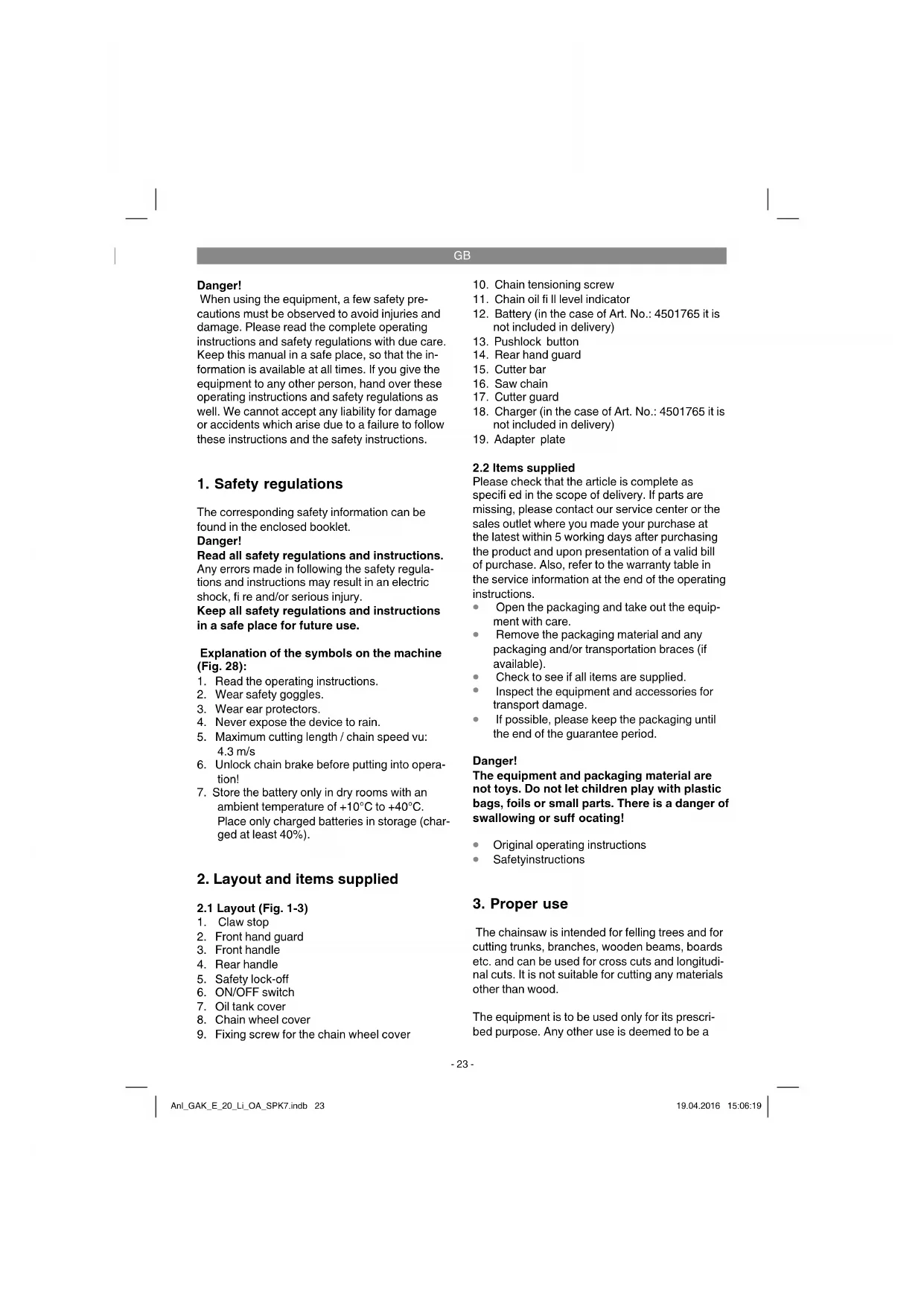 The chainsaw is intended for felling trees and for cutting trunks, branches, wooden beams, boards etc. and can be used for cross cuts and longitudi- nal cuts. It is not suitable for cutting any materials other than wood. The equipment is to be used only for its prescri- bed purpose. Any other use is deemed to be a Anl_GAK_E_20_Li_OA_SPK7.indb 23Anl_GAK_E_20_Li_OA_SPK7.indb 23 19.04.2016 15:06:1919.04.2016 15:06:19GB