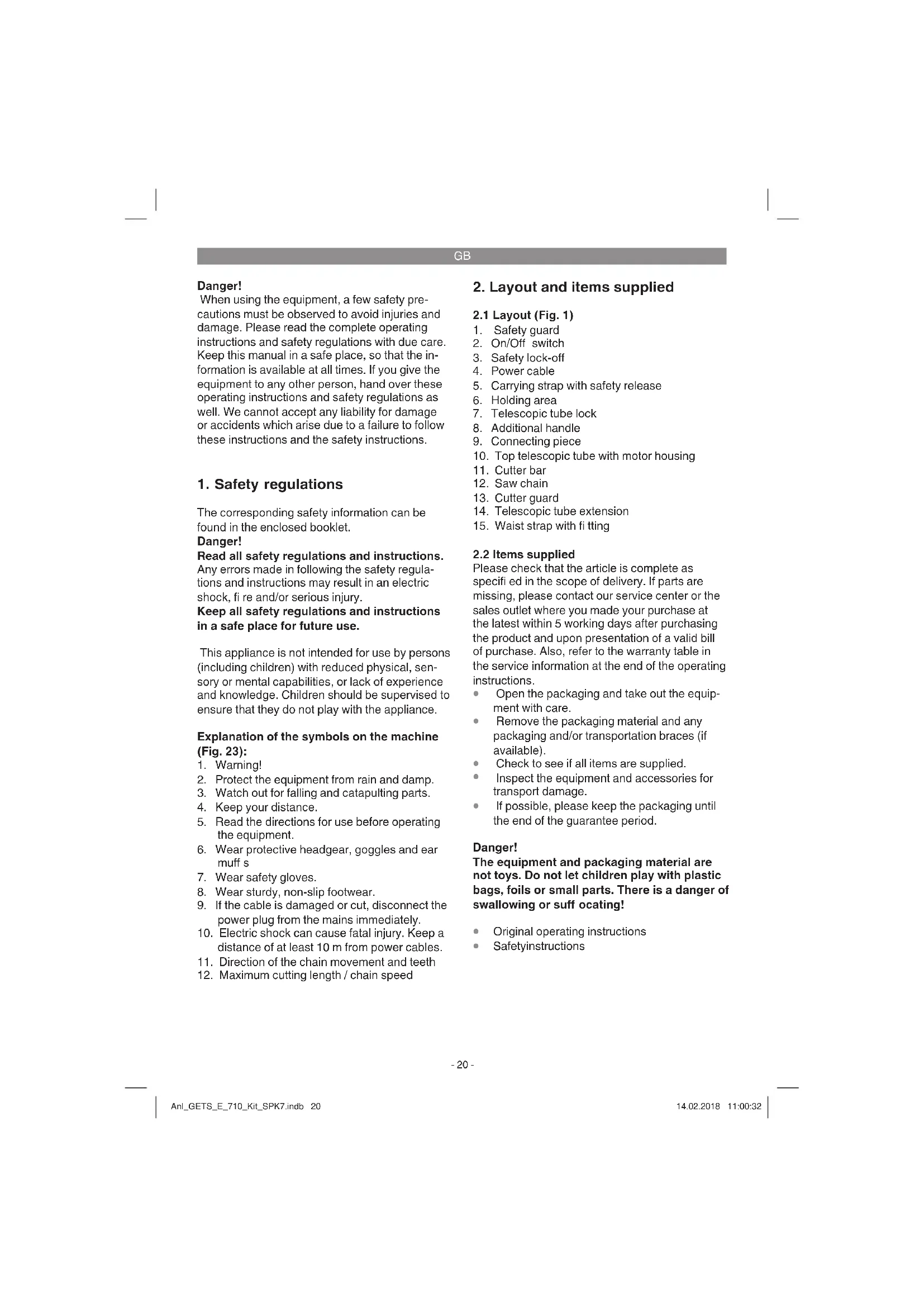 Preparations To ensure that you can work safely, check the following points before every use and in the event of any damage: Condition of the chainsaw Inspect the chainsaw before the start of work for damage to the housing, the power cable, the saw chain and the cutter rail. Never use a chainsaw which is obviously damaged. - Danger of acci- dent! Anl_GETS_E_710_Kit_SPK7.indb 23Anl_GETS_E_710_Kit_SPK7.indb 23 14.02.2018 11:00:3214.02.2018 11:00:32GB