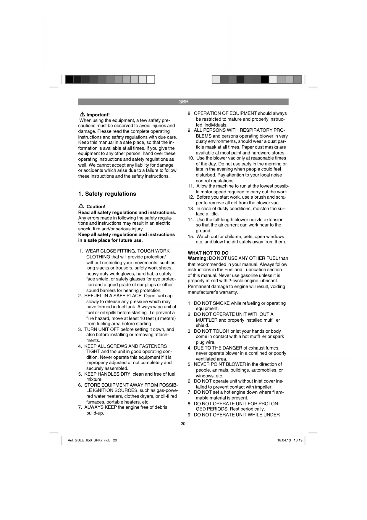 The garden blower vac is designed to handle only foliage and garden refuse such as grass and small branches. Any other use is prohibited. The equipment is to be used only for its prescri- bed purpose. Any other use is deemed to be a case of misuse. The user / operator and not the manufacturer will be liable for any damage or inju- ries of any kind caused as a result of this. Anl_GBLE_650_SPK7.indb 21Anl_GBLE_650_SPK7.indb 21 18.04.13 10:1918.04.13 10:19GBR