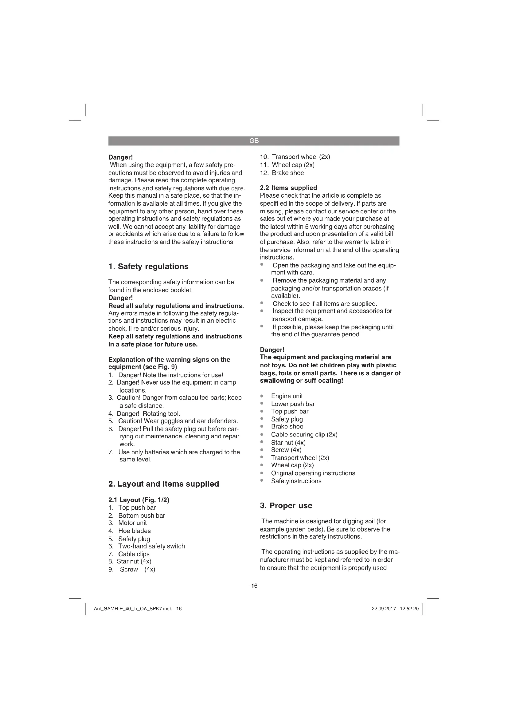 The machine is designed for digging soil (for example garden beds). Be sure to observe the restrictions in the safety instructions. The operating instructions as supplied by the ma- nufacturer must be kept and referred to in order to ensure that the equipment is properly used Anl_GAMH-E_40_Li_OA_SPK7.indb 16Anl_GAMH-E_40_Li_OA_SPK7.indb 16 22.09.2017 12:52:2022.09.2017 12:52:20GB