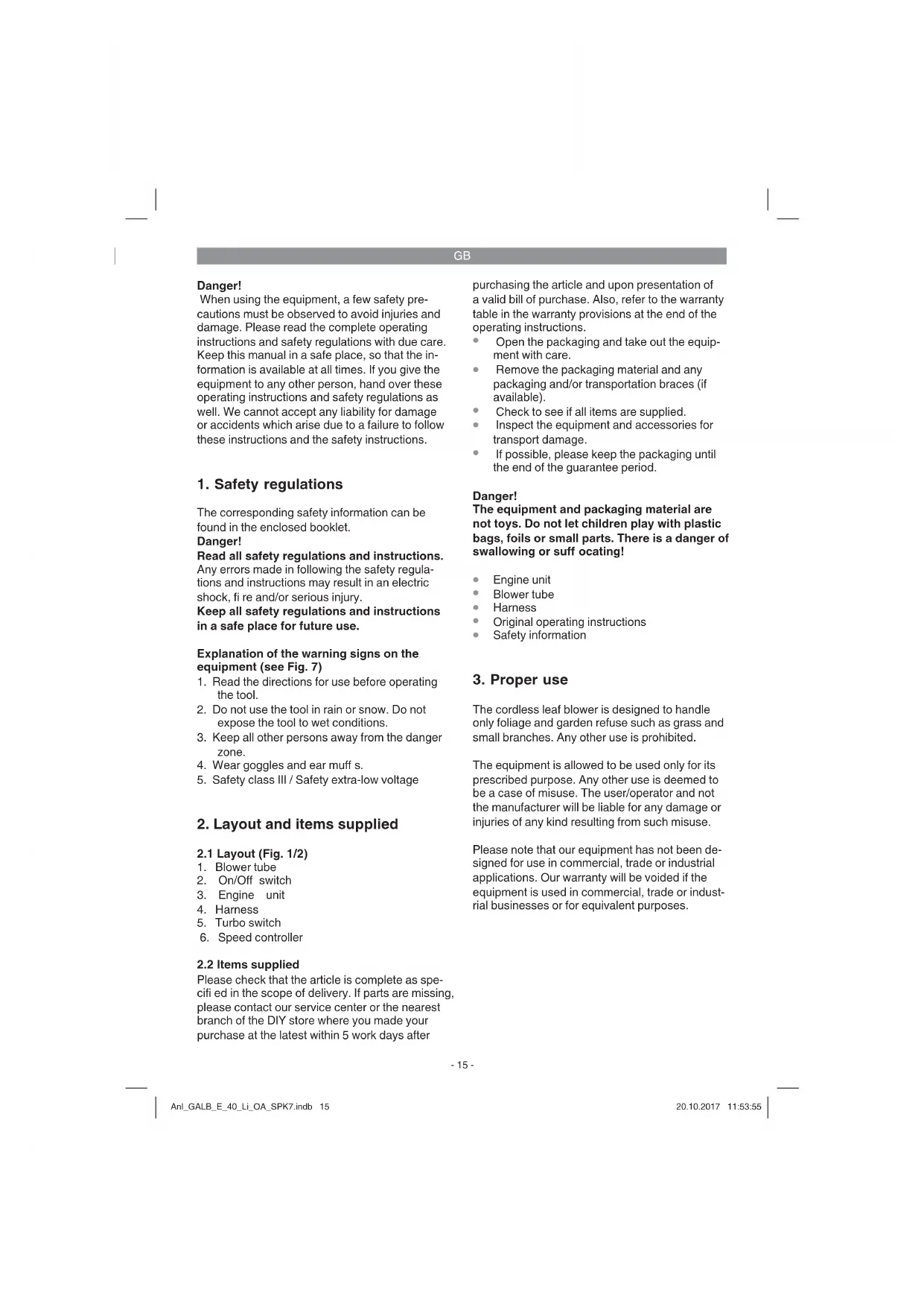 The cordless leaf blower is designed to handle only foliage and garden refuse such as grass and small branches. Any other use is prohibited. The equipment is allowed to be used only for its prescribed purpose. Any other use is deemed to be a case of misuse. The user/operator and not the manufacturer will be liable for any damage or injuries of any kind resulting from such misuse. Please note that our equipment has not been de- signed for use in commercial, trade or industrial applications. Our warranty will be voided if the equipment is used in commercial, trade or indust- rial businesses or for equivalent purposes. Anl_GALB_E_40_Li_OA_SPK7.indb 15Anl_GALB_E_40_Li_OA_SPK7.indb 15 20.10.2017 11:53:5520.10.2017 11:53:55GB