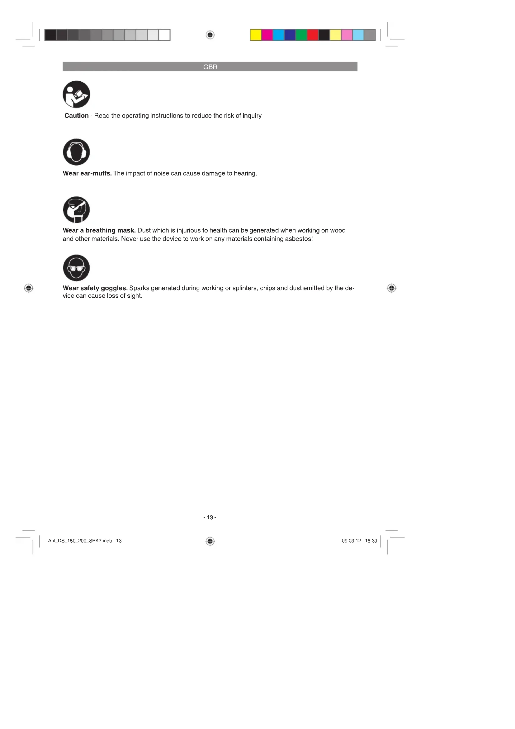 Caution - Read the operating instructions to reduce the risk of inquiry Wear ear-muff s. The impact of noise can cause damage to hearing. Wear safety goggles. Sparks generated during working or splinters, chips and dust emitted by the de- vice can cause loss of sight. Wear a breathing mask. Dust which is injurious to health can be generated when working on wood and other materials. Never use the device to work on any materials containing asbestos! Anl_DS_150_200_SPK7.indb 13Anl_DS_150_200_SPK7.indb 13 09.03.12 15:3909.03.12 15:39GBR