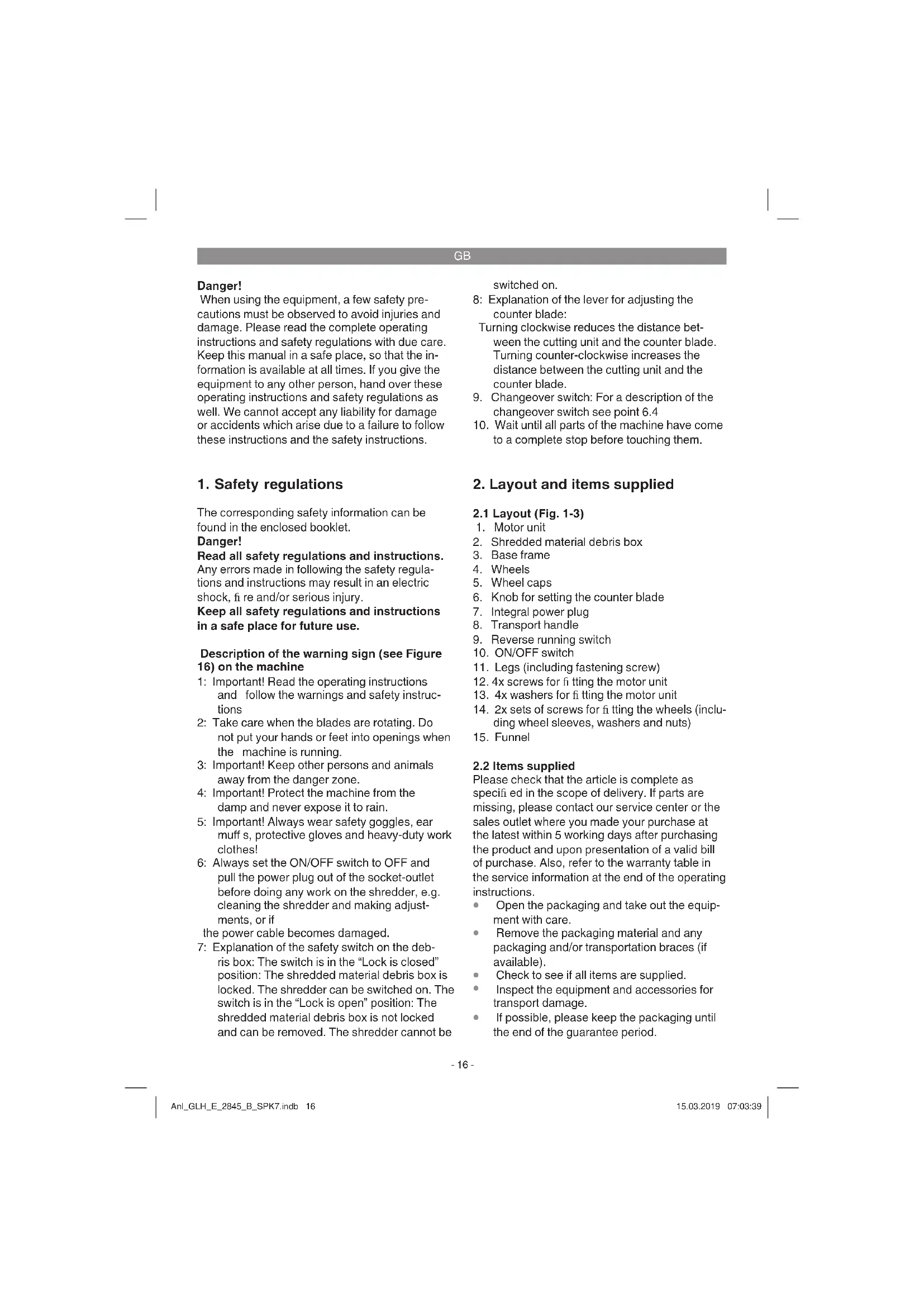 1: Important! Read the operating instructions and follow the warnings and safety instruc- tions 2: Take care when the blades are rotating. Do not put your hands or feet into openings when the machine is running. 3: Important! Keep other persons and animals away from the danger zone. 4: Important! Protect the machine from the damp and never expose it to rain. 5: Important! Always wear safety goggles, ear muff s, protective gloves and heavy-duty work clothes! 6: Always set the ON/OFF switch to OFF and pull the power plug out of the socket-outlet before doing any work on the shredder, e.g. cleaning the shredder and making adjust- ments, or if the power cable becomes damaged. 7: Explanation of the safety switch on the deb- ris box: The switch is in the “Lock is closed” position: The shredded material debris box is locked. The shredder can be switched on. The switch is in the “Lock is open” position: The shredded material debris box is not locked and can be removed. The shredder cannot be switched on. 8: Explanation of the lever for adjusting the counter blade: Turning clockwise reduces the distance bet- ween the cutting unit and the counter blade. Turning counter-clockwise increases the distance between the cutting unit and the counter blade.