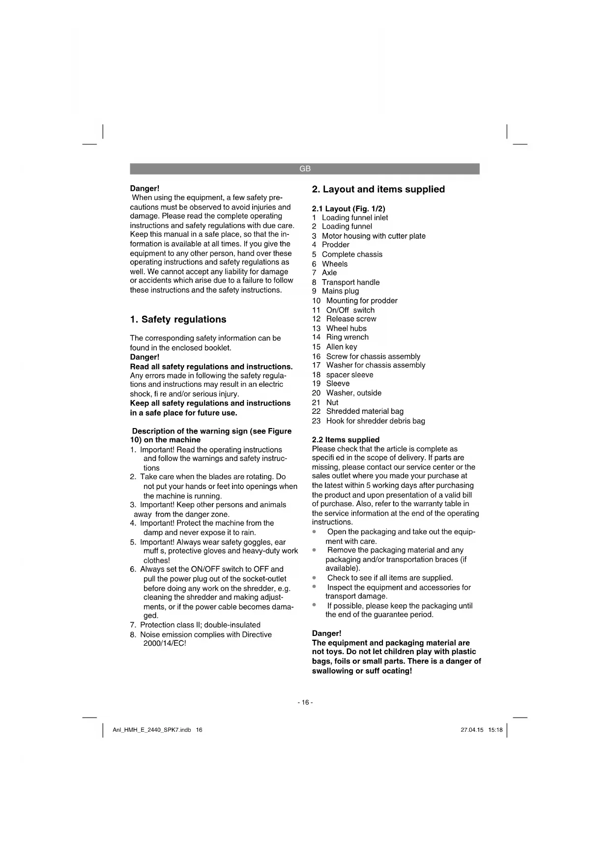If possible, please keep the packaging until the end of the guarantee period. Danger! The equipment and packaging material are not toys. Do not let children play with plastic bags, foils or small parts. There is a danger of swallowing or suff ocating! Anl_HMH_E_2440_SPK7.indb 16Anl_HMH_E_2440_SPK7.indb 16 27.04.15 15:1827.04.15 15:18GB