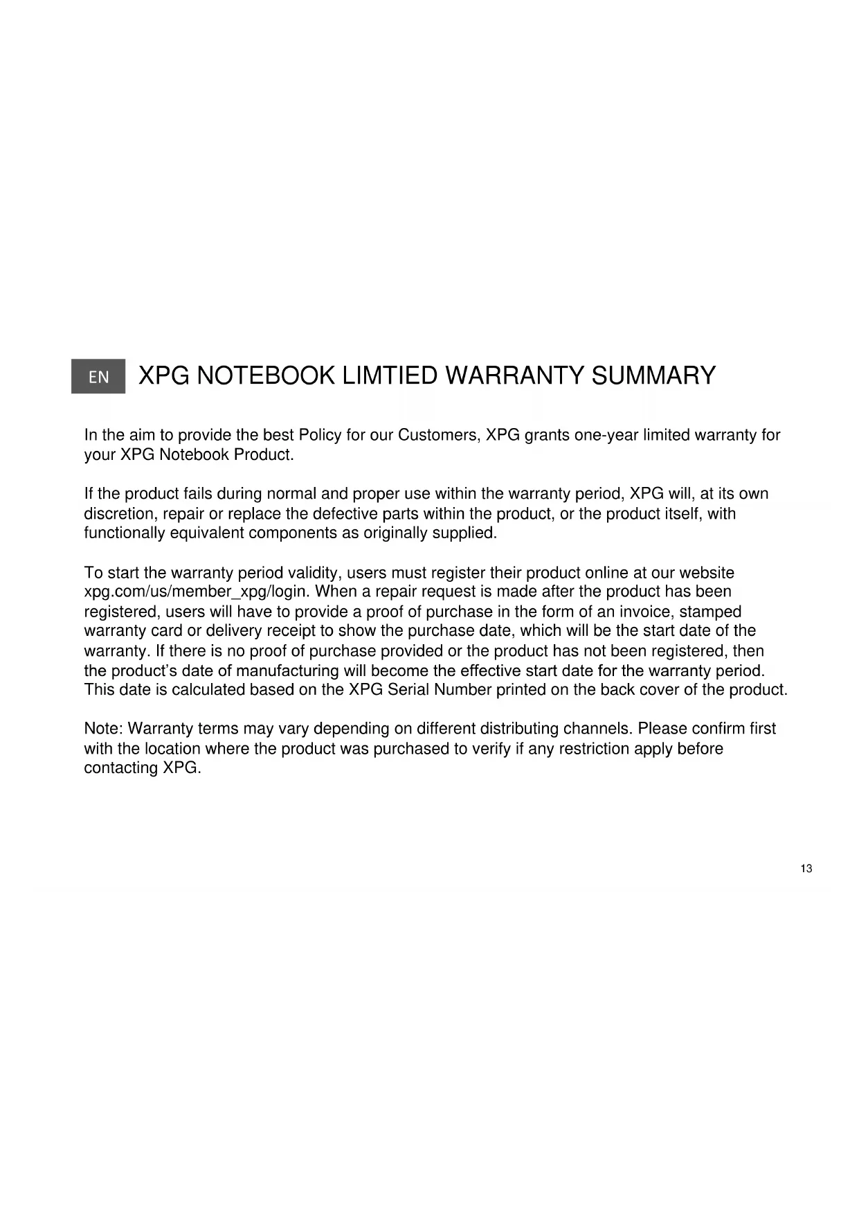 12系統還原 TCIn the aim to provide the best Policy for our Customers, XPG grants one-year limited warranty for your XPG Notebook Product. If the product fails during normal and proper use within the warranty period, XPG will, at its own discretion, repair or replace the defective parts within the product, or the product itself, with functionally equivalent components as originally supplied. To start the warranty period validity, users must register their product online at our website xpg.com/us/member_xpg/login. When a repair request is made after the product has been registered, users will have to provide a proof of purchase in the form of an invoice, stamped warranty card or delivery receipt to show the purchase date, which will be the start date of the warranty. If there is no proof of purchase provided or the product has not been registered, then the product’s date of manufacturing will become the effective start date for the warranty period. This date is calculated based on the XPG Serial Number printed on the back cover of the product. Note: Warranty terms may vary depending on different distributing channels. Please confirm first with the location where the product was purchased to verify if any restriction apply before contacting XPG.