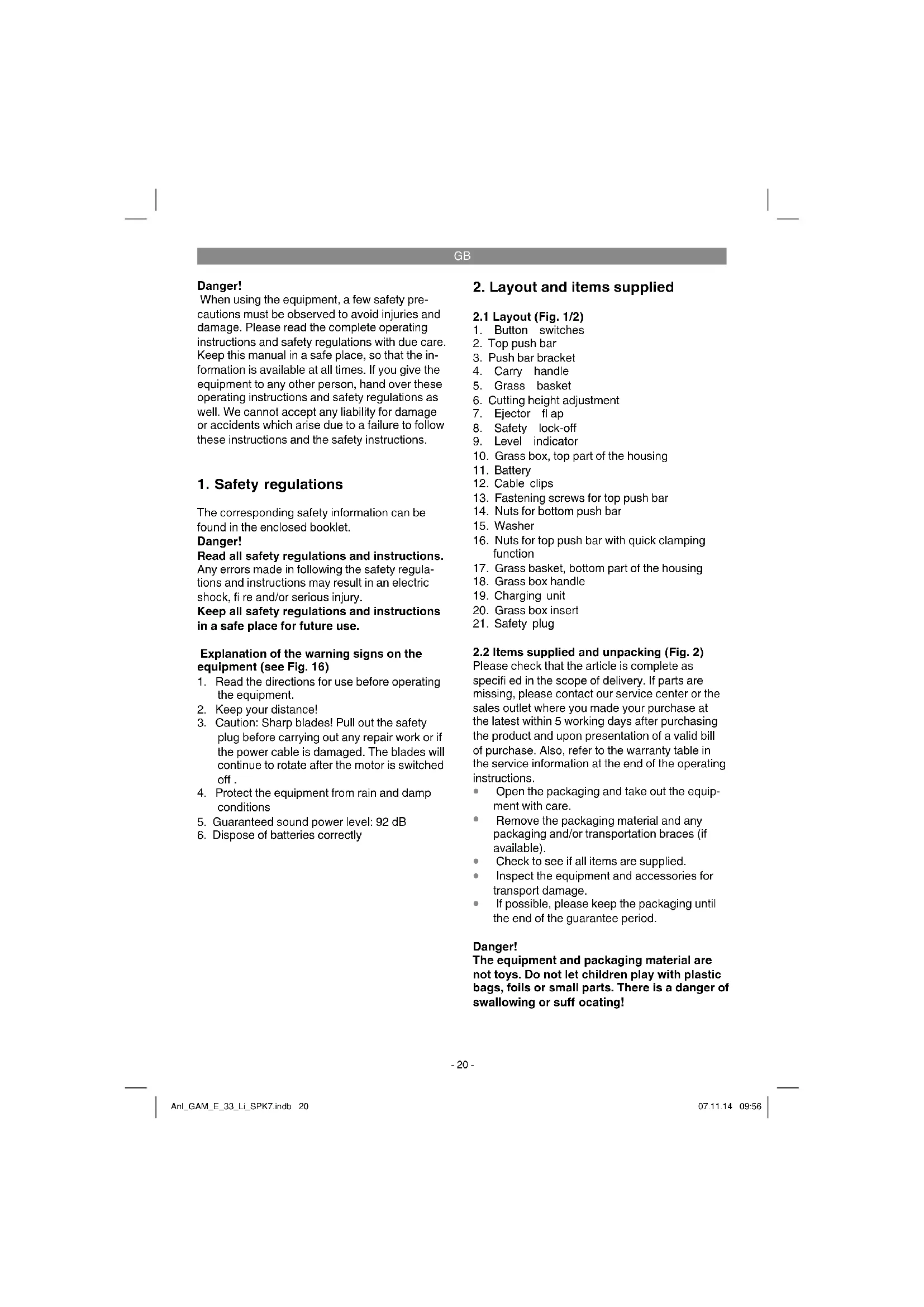 If possible, please keep the packaging until the end of the guarantee period. Danger! The equipment and packaging material are not toys. Do not let children play with plastic bags, foils or small parts. There is a danger of swallowing or suff ocating! Anl_GAM_E_33_Li_SPK7.indb 20Anl_GAM_E_33_Li_SPK7.indb 20 07.11.14 09:5607.11.14 09:56GB