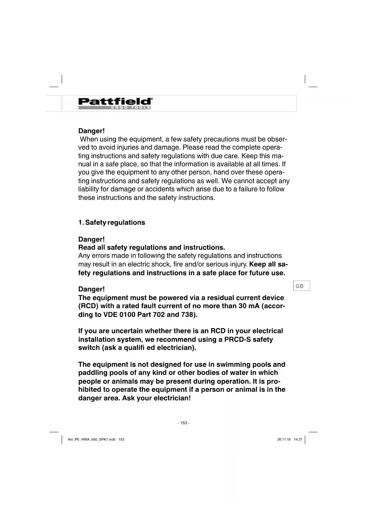 Danger! Read all safety regulations and instructions. Any errors made in following the safety regulations and instructions may result in an electric shock, fi re and/or serious injury. Keep all sa- fety regulations and instructions in a safe place for future use. Danger! The equipment must be powered via a residual current device (RCD) with a rated fault current of no more than 30 mA (accor- ding to VDE 0100 Part 702 and 738). If you are uncertain whether there is an RCD in your electrical installation system, we recommend using a PRCD-S safety switch (ask a qualifi ed electrician). The equipment is not designed for use in swimming pools and paddling pools of any kind or other bodies of water in which people or animals may be present during operation. It is pro- hibited to operate the equipment if a person or animal is in the danger area. Ask your electrician! Anl_PE_HWA_650_SPK7.indb 153Anl_PE_HWA_650_SPK7.indb 153 26.11.15 14:2126.11.15 14:21GB
