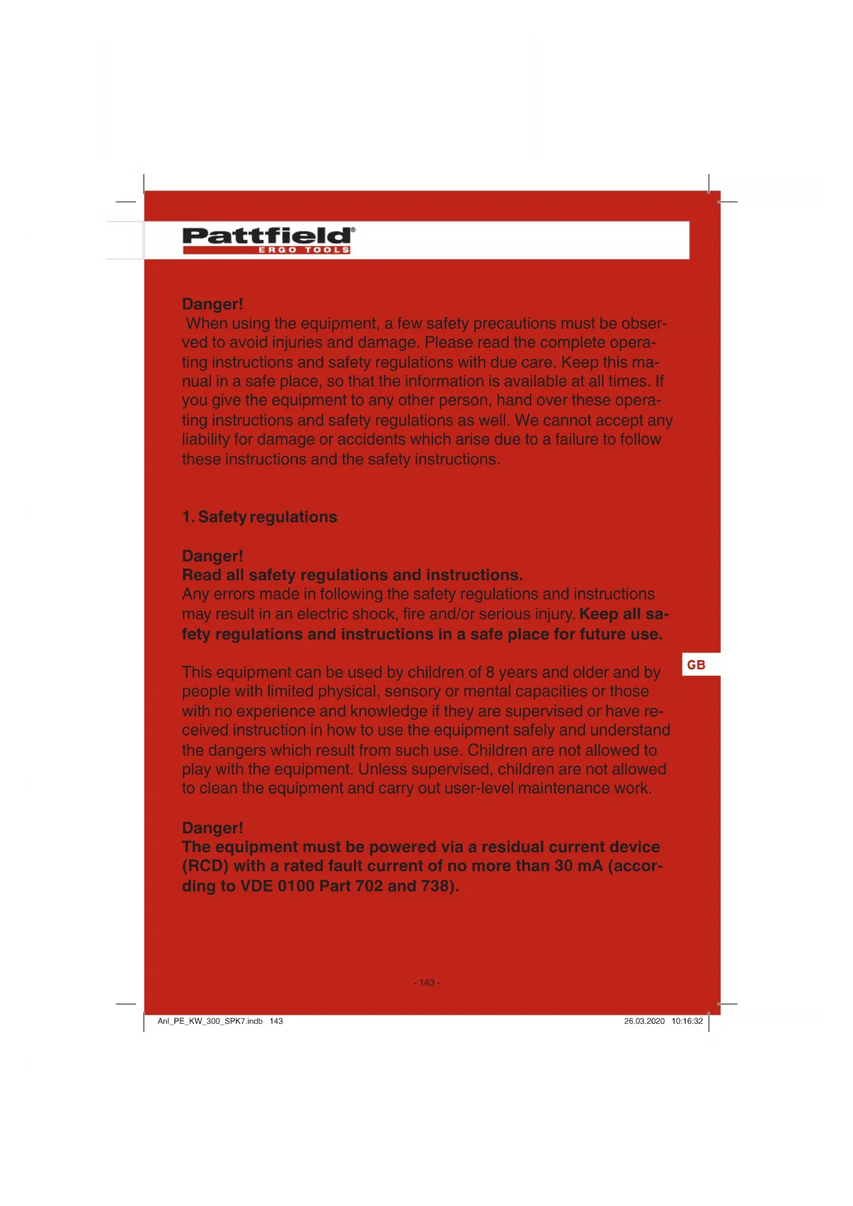 Danger! Read all safety regulations and instructions. Any errors made in following the safety regulations and instructions may result in an electric shock, fi re and/or serious injury. Keep all sa- fety regulations and instructions in a safe place for future use. This equipment can be used by children of 8 years and older and by people with limited physical, sensory or mental capacities or those with no experience and knowledge if they are supervised or have re- ceived instruction in how to use the equipment safely and understand the dangers which result from such use. Children are not allowed to play with the equipment. Unless supervised, children are not allowed to clean the equipment and carry out user-level maintenance work. Danger! The equipment must be powered via a residual current device (RCD) with a rated fault current of no more than 30 mA (accor- ding to VDE 0100 Part 702 and 738). Anl_PE_KW_300_SPK7.indb 143Anl_PE_KW_300_SPK7.indb 143 26.03.2020 10:16:3226.03.2020 10:16:32GB