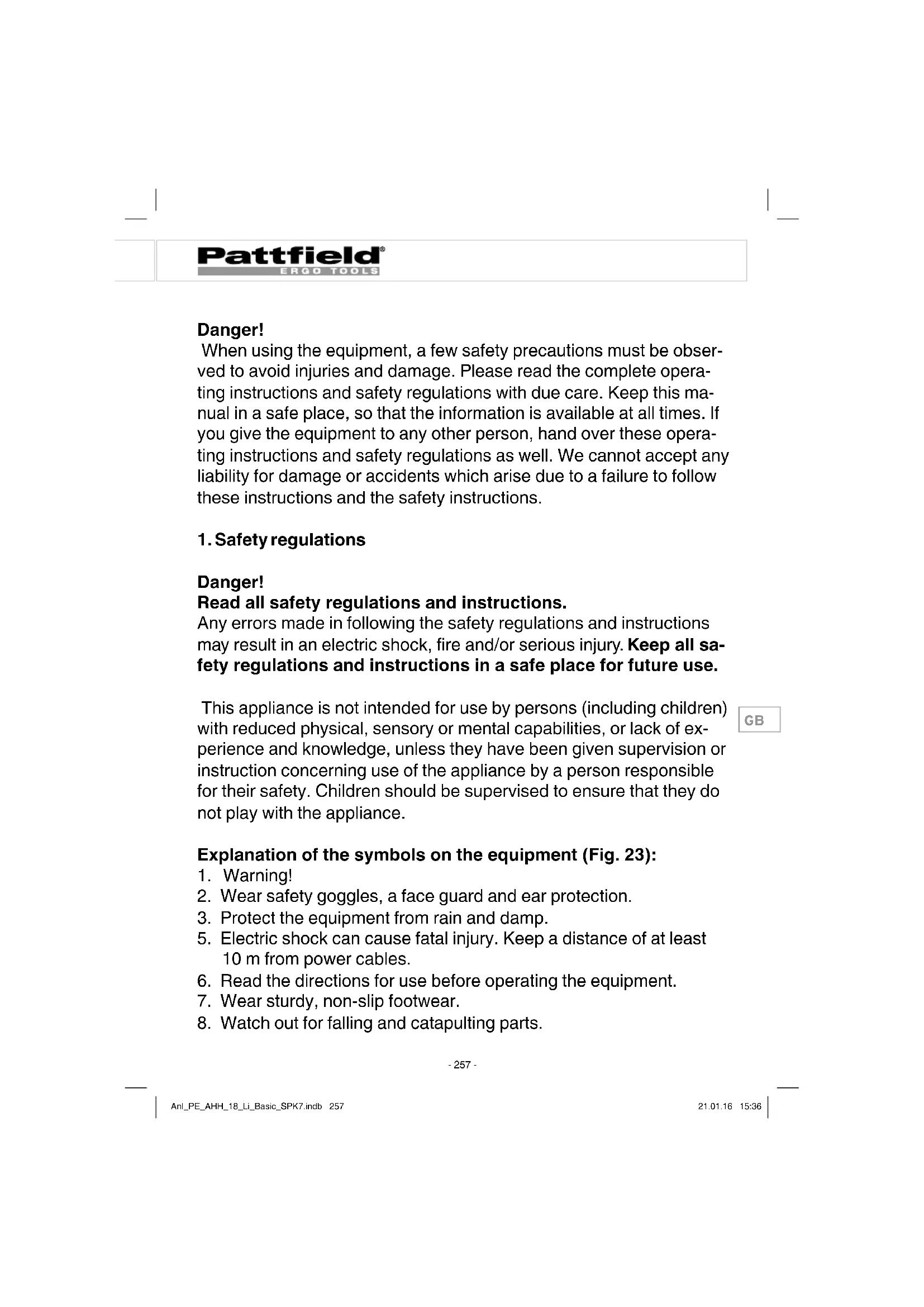 a) Do not overload the appliance. Use the correct tool for your work. You will be able to work better and more safely within the given performance boundaries. b) Do not use an electric tool with a defective switch. An electric tool that cannot be switched on or off is dangerous and must be repaired. c) Pull the plug out of the socket and/or remove the battery be- fore making any adjustments to the appliance, changing ac- cessories or putting the appliance down. This safety measure prevents starting the electric tool unintentionally. d) Keep unused electric tools out of the reach of children. Do not allow people who are not familiar with the appliance or who have not read these instructions to use the appliance. Electric tools are dangerous if they are used by inexperienced people. e) Clean your electric tool carefully. Check whether moving parts are functioning properly and not jamming, whether parts are broken or damaged enough that the functioning of this electric tool is aff ected. Have damaged parts repaired before using the appliance. Many accidents are caused by badly maintained electric tools. f) Keep your cutting tools sharp and clean. Carefully maintained cutting tools with sharp cutting edges will jam less and are easier to control. Anl_PE_AHH_18_Li_Basic_SPK7.indb 260Anl_PE_AHH_18_Li_Basic_SPK7.indb 260 21.01.16 15:3621.01.16 15:36GB