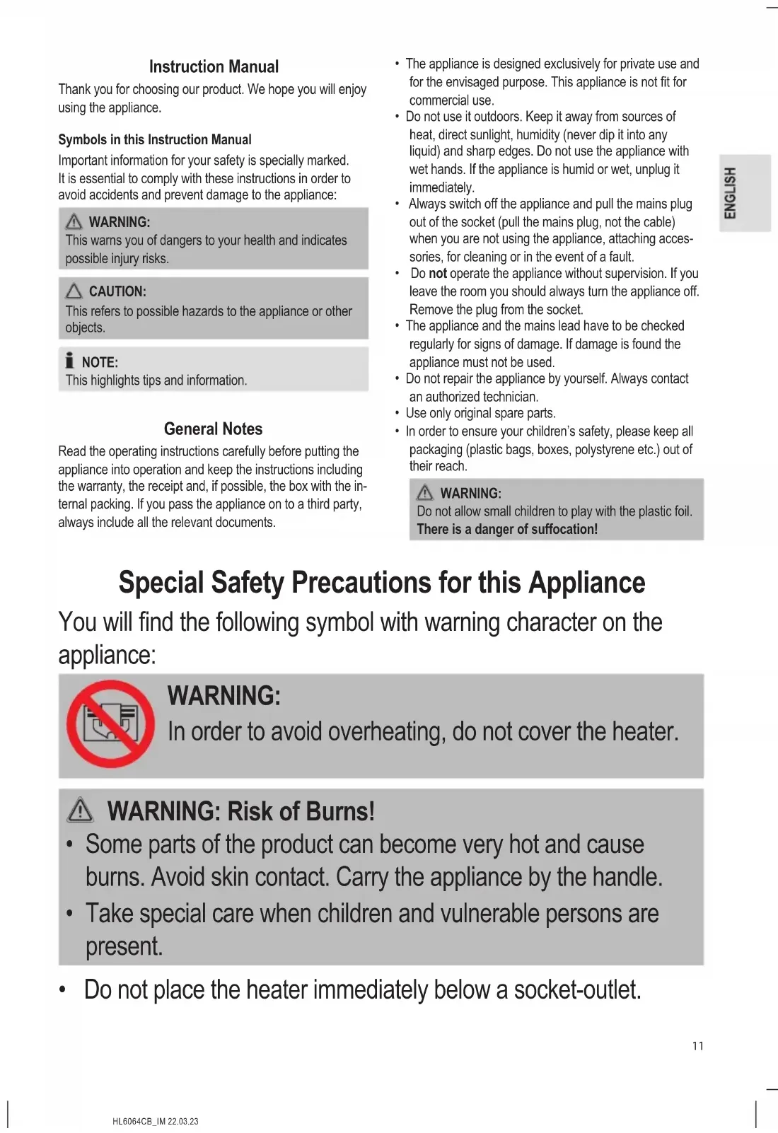 - Do not place the heater immediately below a socket-outlet.HL6064CB_IM 22.03.23