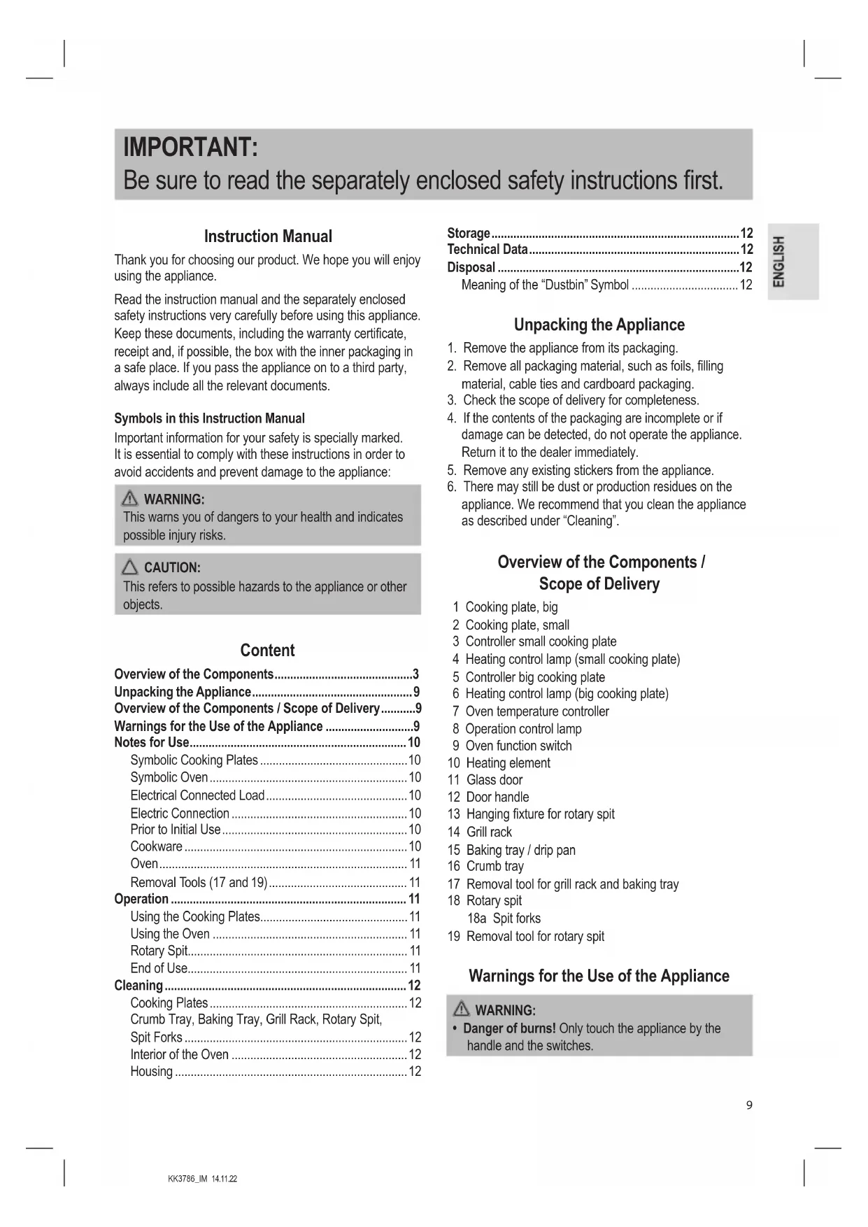 - Always store the appliance out of the reach of children in a well-ventilated and dry place. Technical Data Model:........................................................................KK 3786 Power supply:.....................................220 – 240 V~, 50 / 60 Hz Power consumption: Overall capacity: ..................................................... 3100 W Small cooking plate: .................................................600 W Big cooking plate: ................................................... 1000 W Bottom heat oven: ....................................................700 W Top heat oven: .......................................................... 800 W Protection class: ..................................................................... Net weight: ..................................................... approx. 10.2 kg The right to make technical and design modications in the course of continuous product development remains reserved. This appliance has been tested according to all applicable, current CE directives and built according to the latest safety regulations. Disposal Meaning of the “Dustbin” Symbol Protect our environment: do not dispose of elec- trical equipment in the domestic waste. Please return any electrical equipment that you will no longer use to the collection points provided for their disposal. This helps avoid the potential effects of incorrect disposal on the environment and human health. This will contribute to the recycling and other forms of re-utilisation of electrical and electronic equipment. Information concerning where the equipment can be disposed of can be obtained from your local authority. Your dealer and contractual partner is also obliged to take back the old appliance free of charge.KK3786_IM 14.11.22