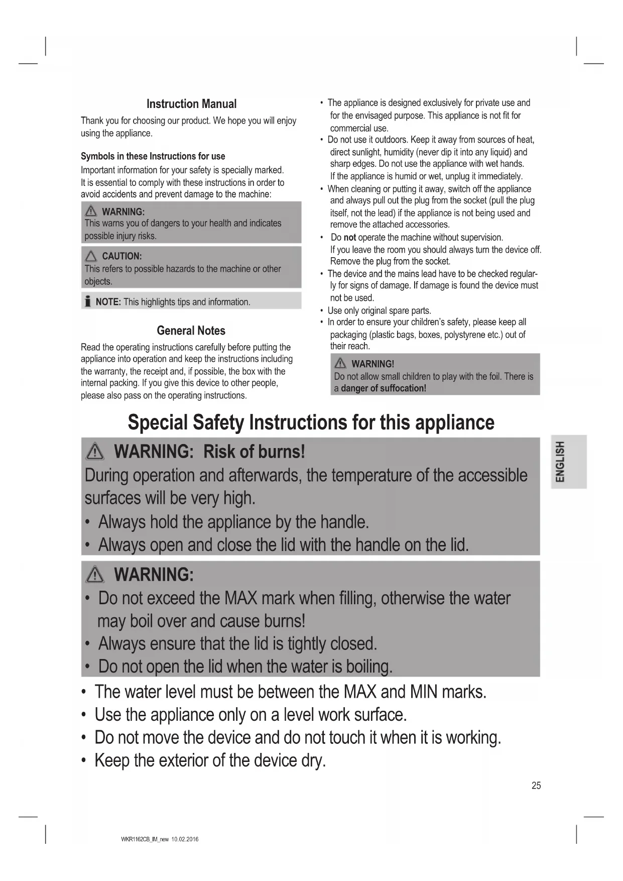 - In order to ensure your children’s safety, please keep all packaging (plastic bags, boxes, polystyrene etc.) out of their reach. WARNING! Do not allow small children to play with the foil. There is a danger of suffocation! Special Safety Instructions for this appliance