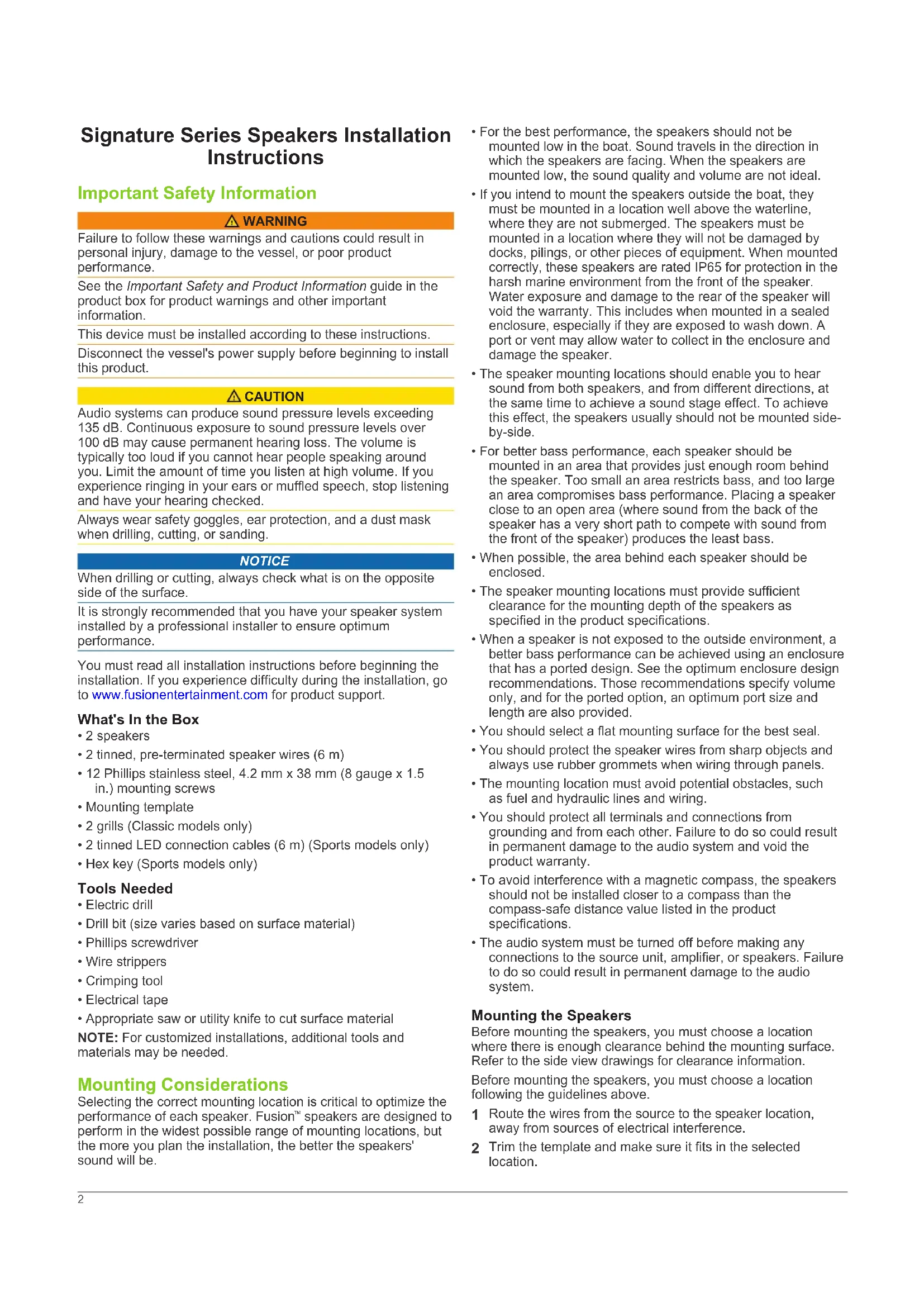 are trademarks of Garmin Ltd. or its subsidiaries. These trademarks may not be used without the express permission of Garmin. November 2014 190-01845-90_0APrinted in ChinaSignature Series Speakers Installation Instructions Important Safety Information WARNING Failure to follow these warnings and cautions could result in personal injury, damage to the vessel, or poor product performance. See the Important Safety and Product Information guide in the product box for product warnings and other important information. This device must be installed according to these instructions. Disconnect the vessel's power supply before beginning to install this product. CAUTION Audio systems can produce sound pressure levels exceeding 135 dB. Continuous exposure to sound pressure levels over 100 dB may cause permanent hearing loss. The volume is typically too loud if you cannot hear people speaking around you. Limit the amount of time you listen at high volume. If you experience ringing in your ears or muffled speech, stop listening and have your hearing checked. Always wear safety goggles, ear protection, and a dust mask when drilling, cutting, or sanding. NOTICE When drilling or cutting, always check what is on the opposite side of the surface. It is strongly recommended that you have your speaker system installed by a professional installer to ensure optimum performance. You must read all installation instructions before beginning the installation. If you experience difficulty during the installation, go to www.fusionentertainment.com for product support. What's In the Box