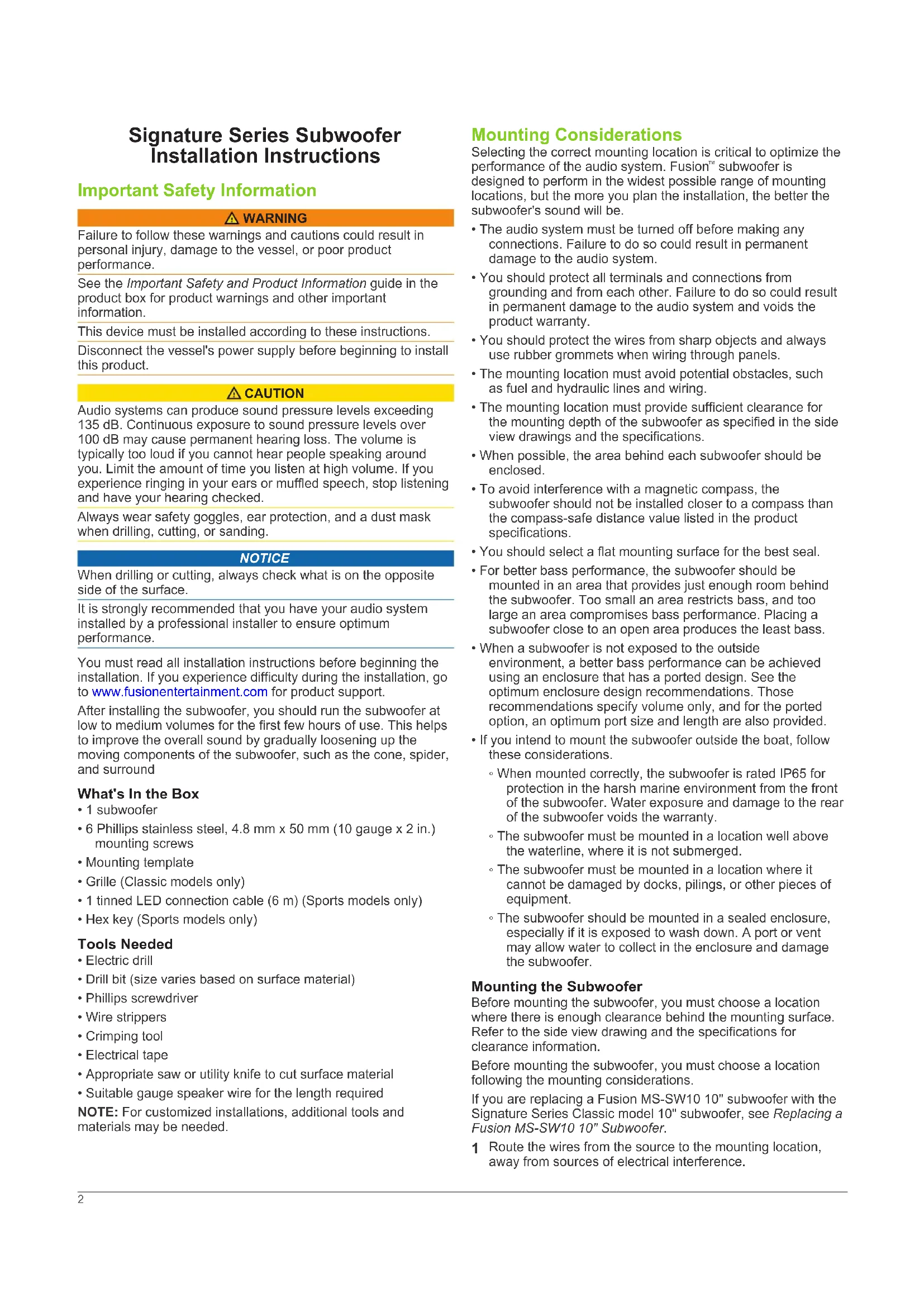 are trademarks of Garmin Ltd. or its subsidiaries. These trademarks may not be used without the express permission of Garmin. December 2014 190-01845-90_0APrinted in ChinaSignature Series Subwoofer Installation Instructions Important Safety Information WARNING Failure to follow these warnings and cautions could result in personal injury, damage to the vessel, or poor product performance. See the Important Safety and Product Information guide in the product box for product warnings and other important information. This device must be installed according to these instructions. Disconnect the vessel's power supply before beginning to install this product. CAUTION Audio systems can produce sound pressure levels exceeding 135 dB. Continuous exposure to sound pressure levels over 100 dB may cause permanent hearing loss. The volume is typically too loud if you cannot hear people speaking around you. Limit the amount of time you listen at high volume. If you experience ringing in your ears or muffled speech, stop listening and have your hearing checked. Always wear safety goggles, ear protection, and a dust mask when drilling, cutting, or sanding. NOTICE When drilling or cutting, always check what is on the opposite side of the surface. It is strongly recommended that you have your audio system installed by a professional installer to ensure optimum performance. You must read all installation instructions before beginning the installation. If you experience difficulty during the installation, go to www.fusionentertainment.com for product support. After installing the subwoofer, you should run the subwoofer at low to medium volumes for the first few hours of use. This helps to improve the overall sound by gradually loosening up the moving components of the subwoofer, such as the cone, spider, and surround What's In the Box